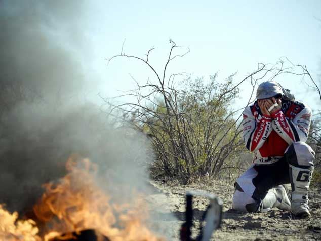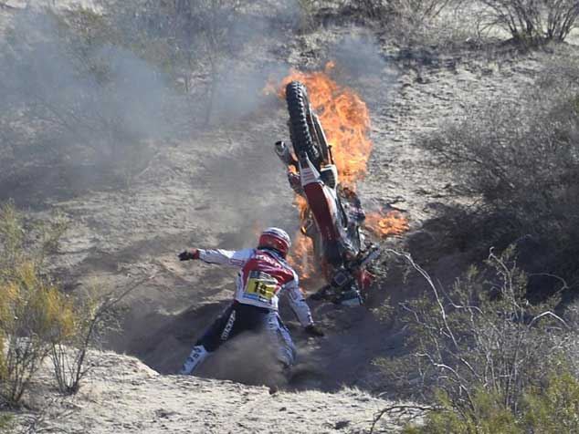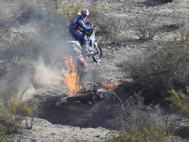 Κορυφαία στιγμή της 5ης ημέρας του Rally Dakar ήταν αυτή όταν η μοτοσικλέτα του Paulo Gonçalves ο οποίος ήταν πρωτοπόρος της σημερινής μέρας μέχρι εκείνη την στιγμή πήρε φωτιά στο 143ο χιλιόμετρο της ειδικής για άγνωστους λόγους προς το παρόν. Η σκηνή του βίντεο είναι συγκλονιστική και κυρίως η έκφραση του οδηγού που δείχνει όλη την απελπισία αλλά και την απογοήτευση που τον κάνει να κλαίει!