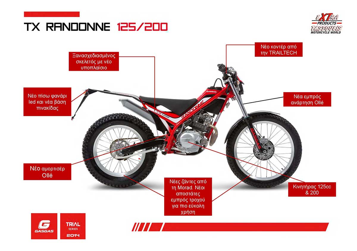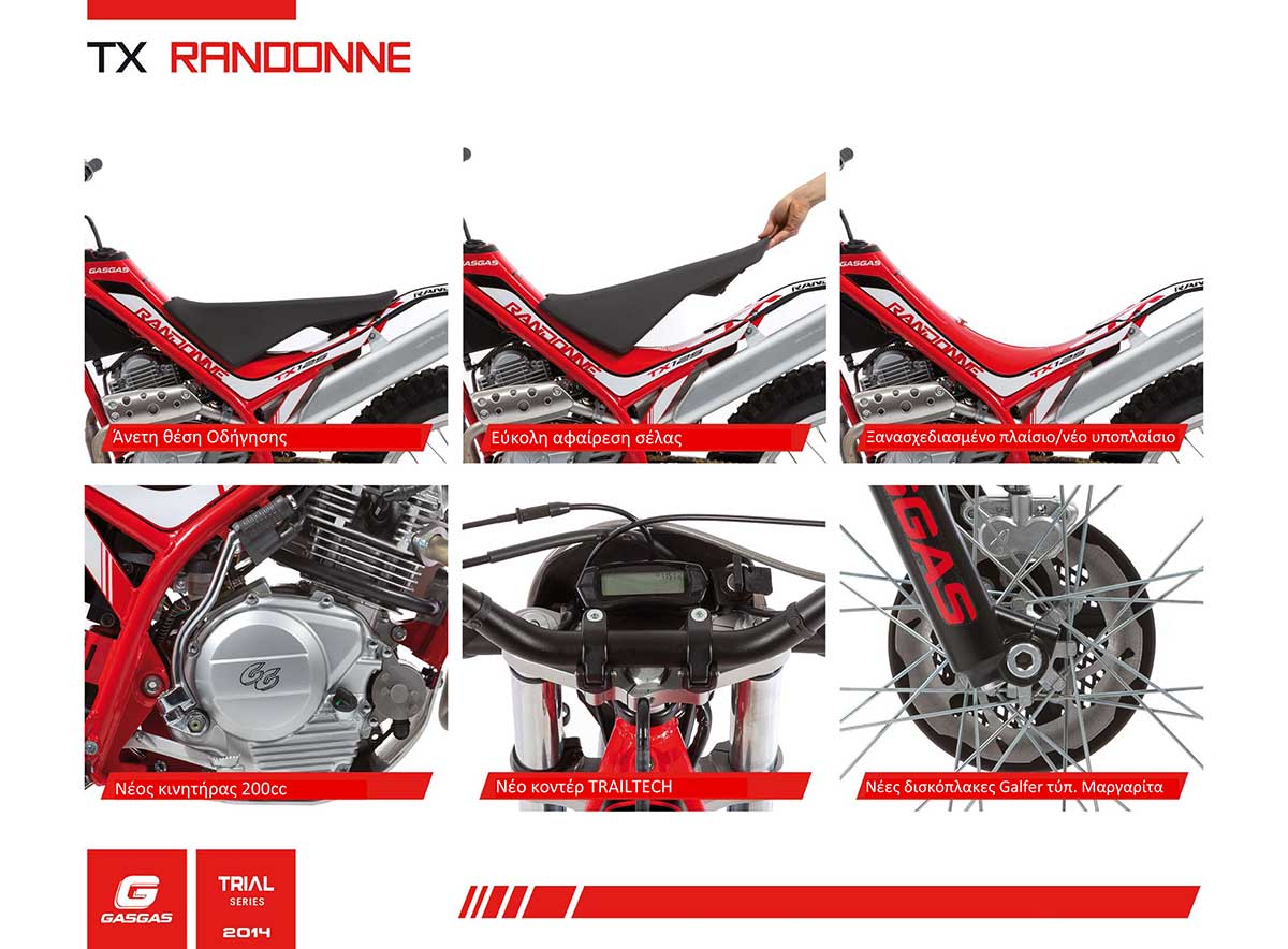 Το TX Randonne είναι σχεδιασμένο από την αρχή, με ξανασχεδιασμένο σκελετό με νέο υποπλαίσιο, νέες ζάντες από τη Morad, νέοι αποστάτες εμπρός τροχού για πιο εύκολη χρήση, νέα δισκόφρενα τύπου μαργαρίτα,νέο φανάρι led και νέα βάση πινακίδας, νέο κοντέρ από την TRAILTECH και νέα αμορτισέρ από την Olle