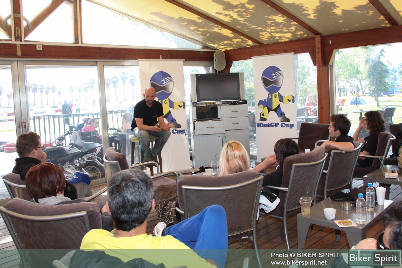 Επίσης μίλησε και ο υπεύθυνος της εταιρείας IMR , Δημοσθένης Μαυρόπουλος παρουσιάζοντας την μεγάλη πρόσφορα προς τους αθλητές του “MiniGP Cup” όπου δίνει την δυνατότητα στους τρεις πρώτους οδηγούς σε κατάταξη με IMR μοτοσικλέτες να αγωνιστούν στην Ισπανία σε αγώνα endurance του Ισπανικού Πρωταθλήματος με όλα τα έξοδα πληρωμένα από την IMR προσφέροντας τους την ευκαιρία για μια διεθνή καριέρα. Μια δεύτερη και σημαντική προσφορά της ίδιας εταιρείας είναι η Αγωνιστική ιδική τιμή για τους συμμετέχοντες στην συγκεκριμένη διοργάνωση κατεβάζοντας τις τιμές των Minigp 150cc από 2150€ στα 1700€ και COPA GP 155cc από 2050€ και παλι στα 1700€ με βασική προϋπόθεση για την έκπτωση το αποδεικτικό της συμμετοχής στους αγώνες MiniGP Cup