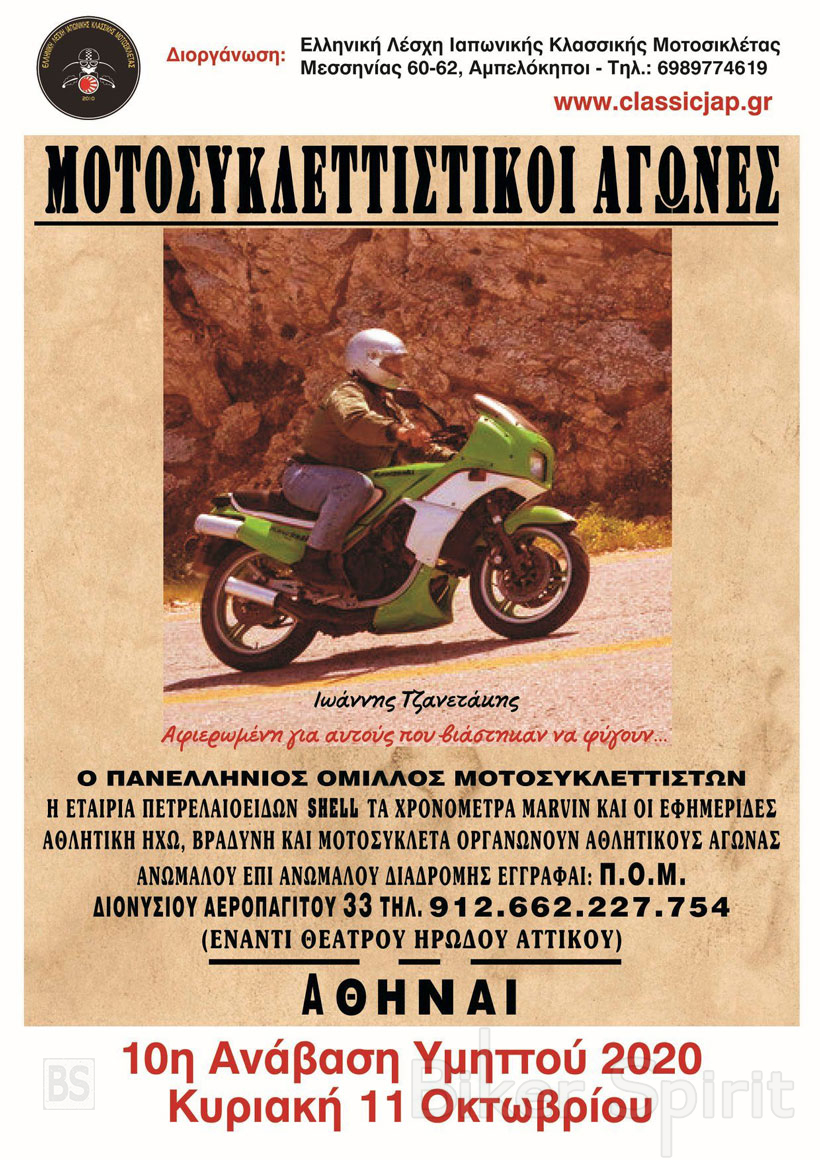 10η Ανάβαση Υμηττού ( Regularity ) < Ιωάννης Τζανετάκης > Κυριακή / 11 / Οκτωβρίου ώρα 11.00 στο Τέρμα Λεωφορείων Καισαριανής ( στα ξύλινα ), από την Ελληνική Λέσχη Ιαπωνικής Κλασσικής Μοτοσικλέτας.