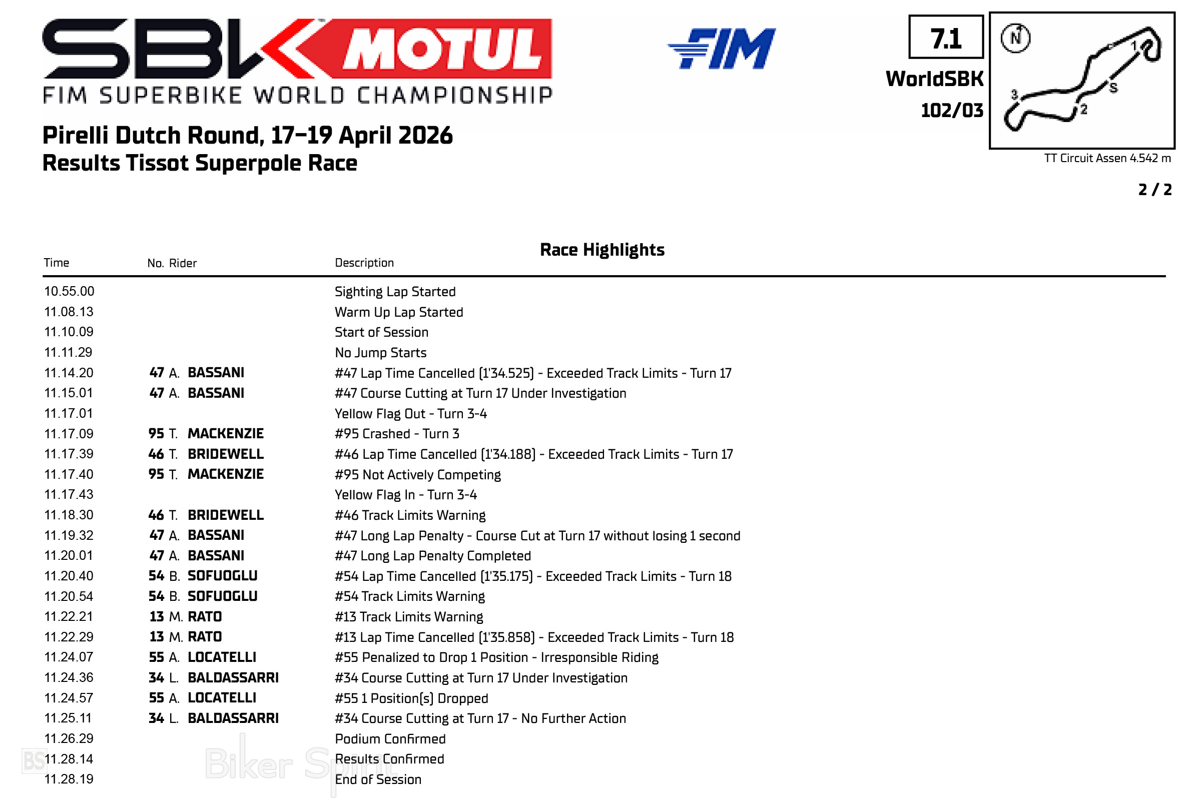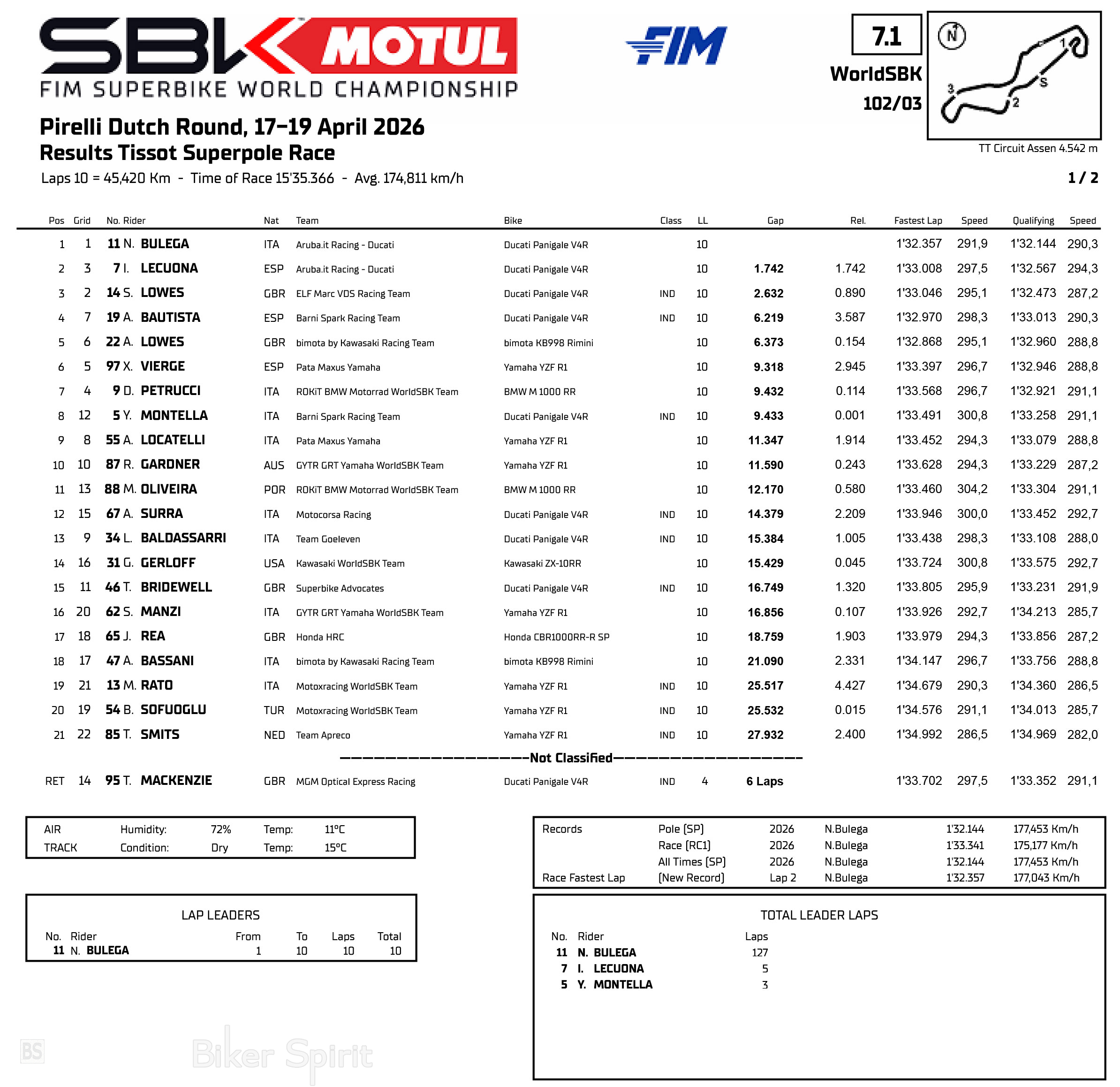 Ο Superpole αγώνας στο Assen επιβεβαίωσε την εικόνα του πρώτου αγώνα, με τη Ducati να κυριαρχεί ξανά και τους Nicolo Bulega, Iker Lecuona και Sam Lowes να τερματίζουν στις τρεις πρώτες θέσεις. Ακόμη μια συνεχόμενη νίκη για τον Bulega που έφτασε της 12.