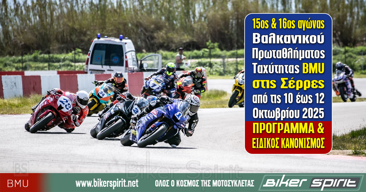 Η Αγωνιστική χρονιά του Βαλκανικού πρωταθλήματος ταχύτητας (BMU European Road Racing Championship 2025) κλείνει με τον 2ο διπλό αγώνα στις Σέρρες, με τον 15ο και 16ο αγώνα στην πίστα των Σερρών. Να υπενθυμίσουμε ότι οι αγώνες αυτοί δεν περιλαμβάνουν το Πανελλήνιο Πρωτάθλημα Ταχύτητας καθώς αυτοί έχουν οριστεί για τις 7 με 9 Νοεμβρίου στην πίστα των Μεγάρων.