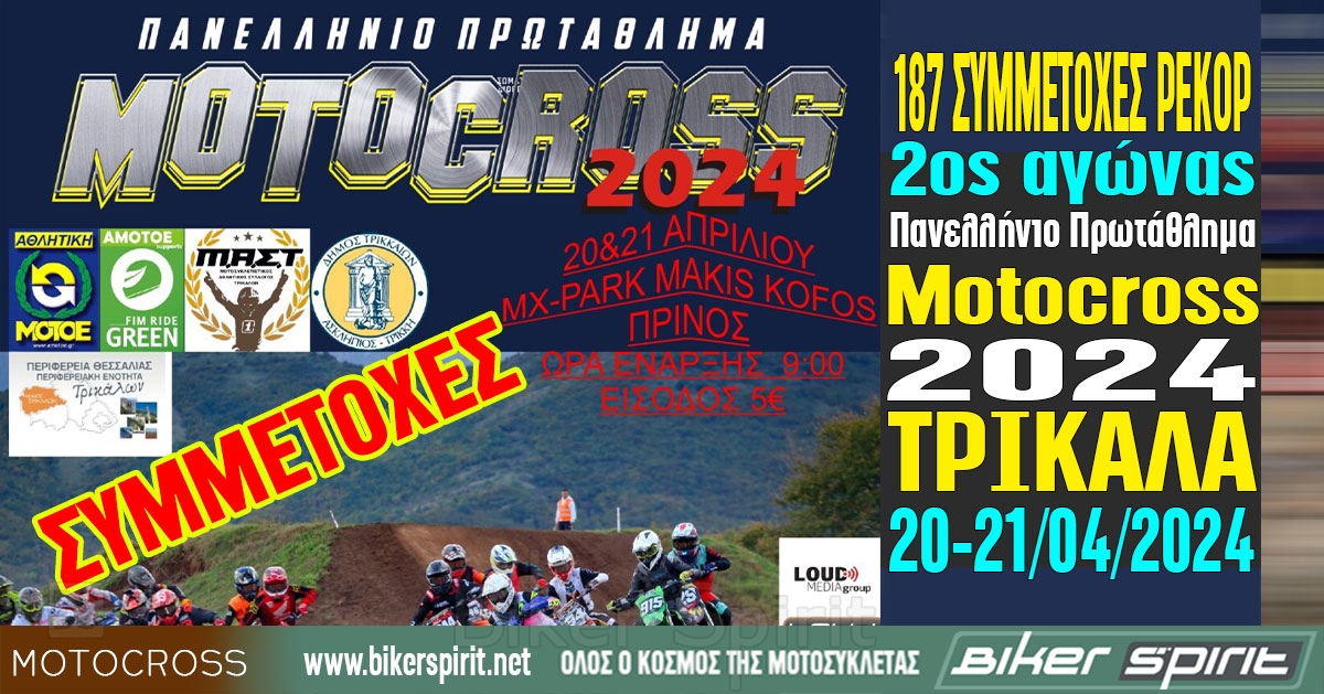 Δείτε τις 187 ΣΥΜΜΕΤΟΧΕΣ του 2ου αγώνα Πανελληνίου Πρωταθλήματος Motocross 2024 που θα γίνει στα Τρίκαλα.