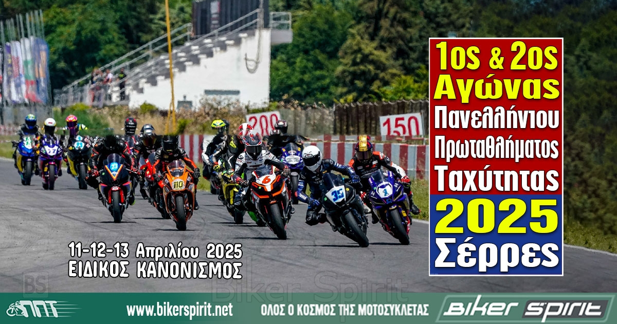 Στα πλαίσια διεξαγωγής του 1ου και 2ου αγώνα Βαλκανικού Πρωταθλήματος Ταχύτητας θα πραγματοποιηθούν και οι 1ος & 2ος αγώνες, για το Πανελλήνιο Πρωτάθλημα Ταχύτητας μοτοσυκλετών. Οι αγώνες θα πραγματοποιηθούν στις 11-12-13 Απριλίου 2025 στο Αυτοκινητοδρόμιο των Σερρών.