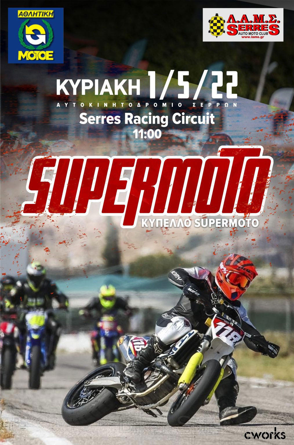 Το αθλητικό σωματείο Λ.Α.Μ.ΣΕΡΡΩΝ μετά από έγκριση της Α.ΜΟΤ.Ο.Ε διοργανώνει την 01-05-2022 τον 1ο αγώνα του Κυπέλλου Supermoto για το έτος 2022.