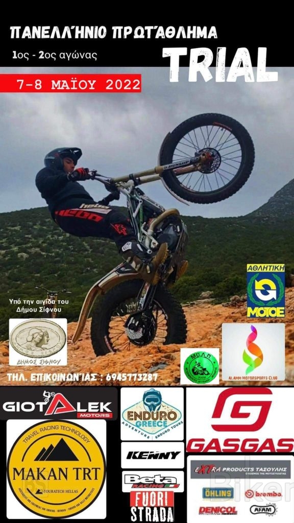 Για το προσεχές Σαββατοκύριακο 7 και 8 Μαΐου έχουν προγραμματιστεί στην Σίφνο οι πρώτοι δύο αγώνες του φετινου Πανελληνίου Πρωταθλήματος Trial, μετά από αναβολή τριών εβδομάδων.