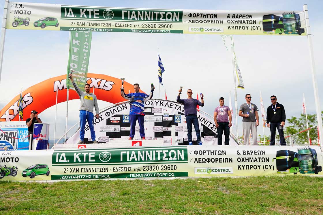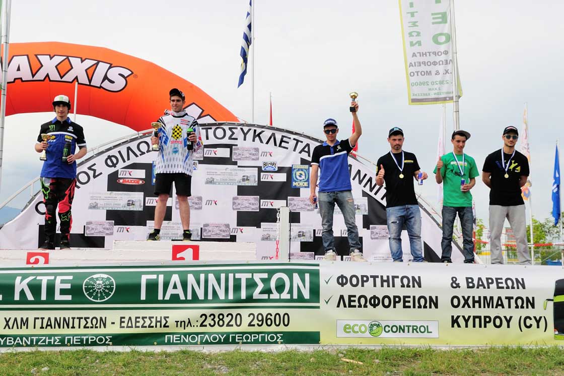 Οι μάχες των δύο αναβατών είναι μοναδικές, με τις μεγάλες τετράχρονες μοτοσυκλέτες των 450 κυβικών τους να εξαφανίζουν τα άλματα και τα μεγάλα σαμάρια της πίστας. Το κυνήγι διαρκείας του Παναγιώτη Κουζή αποδίδει και καταφέρνει μέσα στο πρώτο σκέλος να περάσει τον Δημήτρη Κοντολέτα, βάζοντας πλώρη για την τρίτη φετινή του νίκη. Πράγματι, ψηλός αναβάτης της Honda, Παναγιώτης Κουζής, βλέπει πρώτος για άλλη μια φορά φέτος το πέσιμο της καρό σημαίας του τερματισμού. Επαναλαμβάνοντας το ίδιο κατόρθωμα και στο δεύτερο τελικό σκέλος της ΜΧ1, θα φύγει από τα Γιαννιτσά με το βαθμολογικό και το ψυχολογικό προβάδισμα των τεσσάρων νικών φέτος στα αντίστοιχα τέσσερα σκέλη. Την ίδια στιγμή, ο Δημήτρης Κοντολέτας, αρκείται σε δύο δεύτερες θέσεις στον αγώνα των Γιαννιτσών, αλλά πλέον θα συνεχίσει την μεγάλη του προσπάθεια για την συνέχεια με τη σιγουριά ότι, τουλάχιστον σε επίπεδο ταχύτητας, μπορεί να τα βάλει με τον Παναγιώτη Κουζή. Κι ενώ ο Παναγιώτης Κουζής συνεχίζει να είναι ο μοναδικός νικητής για φέτος στην ΜΧ1, το ίδιο δεν συμβαίνει και στην έτερη κατηγορία ΜΧ2, όπου ο μοναδικός νικητής της Χαλκίδας, Γιάννης Τουρατζίδης, δείχνει κάπως κουρασμένος και δεν μπορεί να κυνηγήσει τις νίκες. Αρκείται σε δύο τρίτες θέσεις, και δίνει έτσι το δικαίωμα στην διάκριση σε δύο άλλους συναθλητές του.