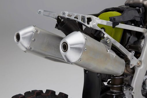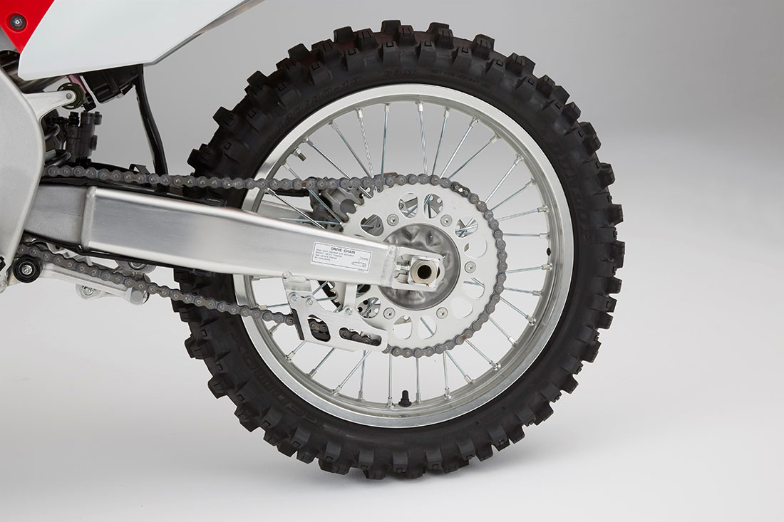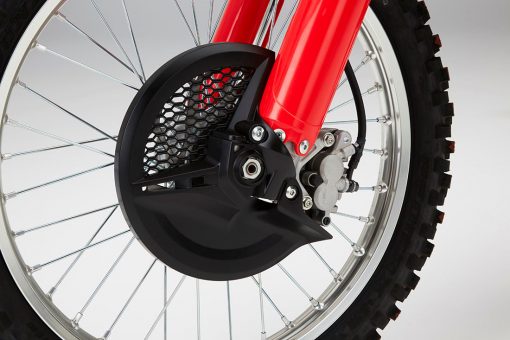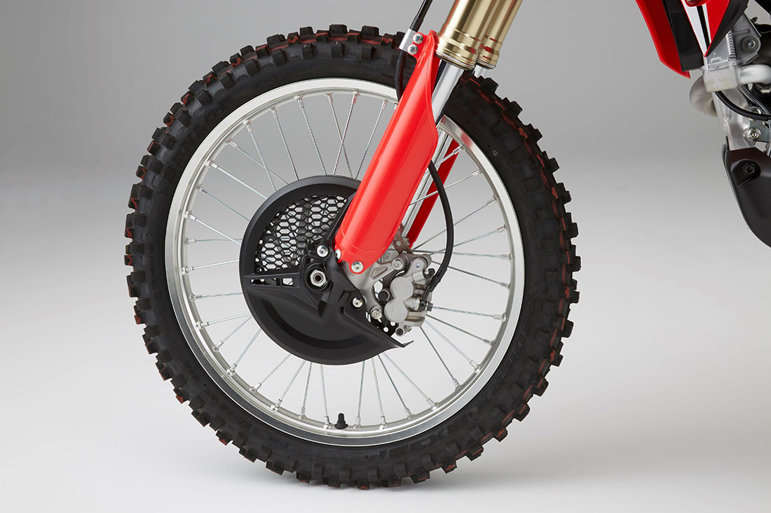 Ο εμπρός δίσκος του φρένου έχει κυματοειδή περίμετρο με διάμετρο 260mm και πετυχαίνει αποτελεσματική διάχυση της θερμότητας, ισχύ και αίσθηση από τη διπίστονη δαγκάνα. Πίσω χρησιμοποιείται ένας αντίστοιχος δίσκος κυματοειδούς σχήματος διαμέτρου 240mm με μονοπίστονη δαγκάνα. Ελαφρές αλουμινένιες ζάντες με ακτίνες άμεσης έδρασης μειώνουν το μη αναρτώμενο βάρος. Η διάσταση του εμπρός τροχού είναι 21 x 1,6in, και του πίσω 19 x 2,15in. Ο βασικός εξοπλισμός περιλαμβάνει ειδικά ελαστικά MX3SF και MX3S της Dunlop για «μαλακά» εδάφη.