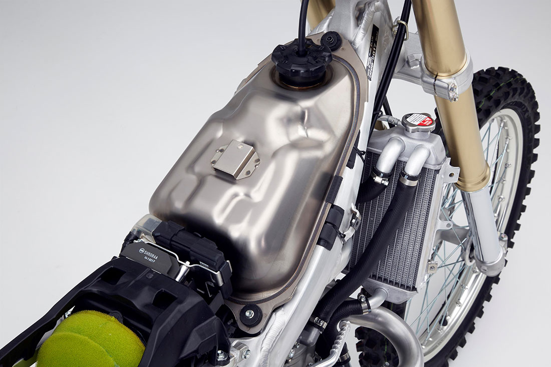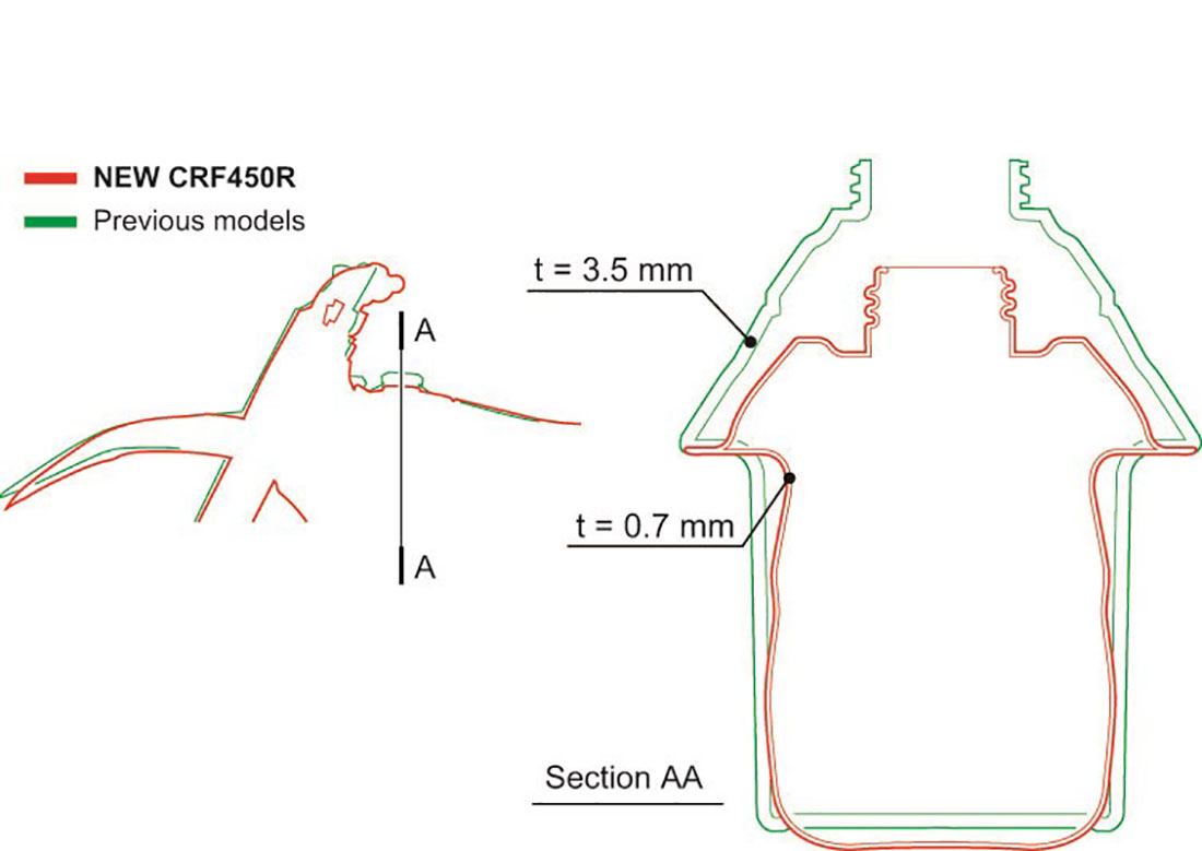 Το νέο μοντέλο CRF450R χρησιμοποιεί ρεζερβουάρ καυσίμου από τιτάνιο 6,3L, που ζυγίζει 513g λιγότερο από το πλαστικό που αντικαθιστά. Η μείωση κατά μισό κιλό συμβάλλει σημαντικά στο χαμηλότερο κέντρο βάρους. Νέα πλαστικά με ομοιόμορφες εξωτερικές γραμμές προσφέρουν στον αναβάτη μεγαλύτερη ελευθερία κινήσεων ενώ το εμπρός τμήμα είναι στενό. Τα καλύμματα ψυγείου έχουν μειωμένο πλάτος κατά 30mm και το εμπρός φτερό δημιουργεί αποδοτική ροή αέρα προς το ψυγείο. Τα πλαστικά μέρη διαθέτουν ανθεκτικά στις γρατζουνιές γραφικά ενσωματωμένα σε φιλμ που καλύπτουν μία ευρεία περιοχή.