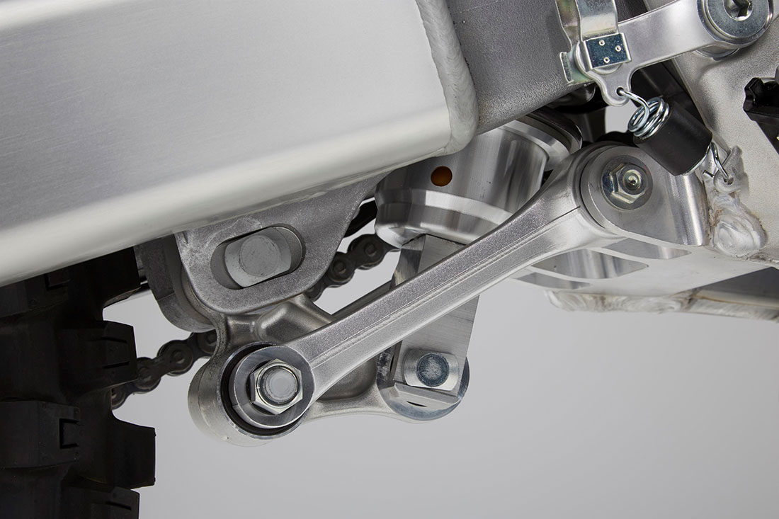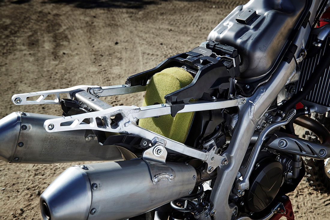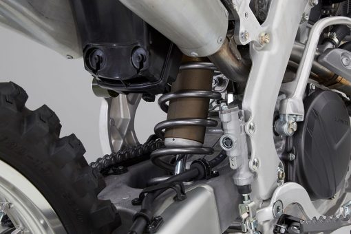 Η πάνω βάση του πλήρως ρυθμιζόμενου πίσω αμορτισέρ της Showa τοποθετείται 39mm χαμηλότερα ενώ το ίδιο το αμορτισέρ βρίσκεται στο κέντρο της μοτοσυκλέτας για βέλτιστη συγκέντρωση των μαζών και σταθερότητα στις υψηλές ταχύτητες (ήταν σε κατά 5mm έκκεντρη θέση). Με μήκος 599mm το αλουμινένιο ψαλίδι είναι 18mm κοντύτερο από αυτό του απερχόμενου μοντέλου CRF450R, με βραχίονες πιο λεπτής διατομής. Επίσης είναι ελαφρύτερο κατά 220g.