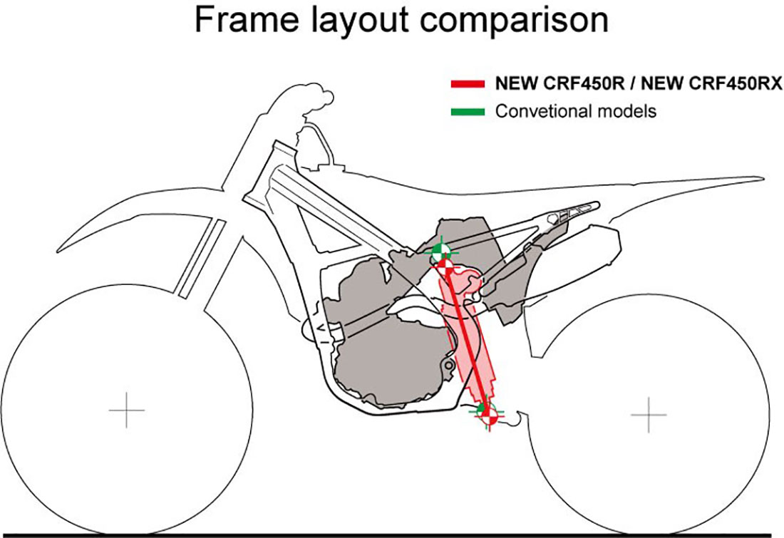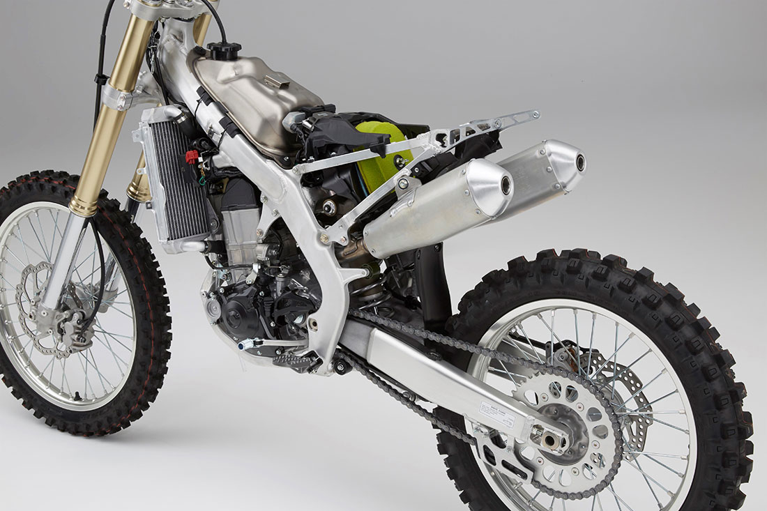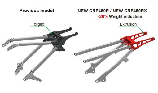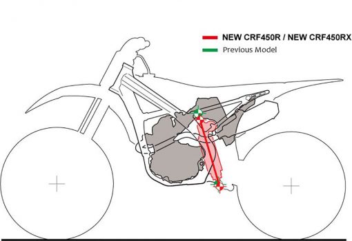 Το πλήρως ανασχεδιασμένο πλαίσιο χαρίζει στον αναβάτη απόλυτο έλεγχο του νέου, ισχυρότερου κινητήρα της μοτοσυκλέτας CRF450R. Οι στόχοι για την 7η γενιά του αλουμινένιου πλαισίου της CRF ήταν σαφείς: να βελτιωθούν οι επιδόσεις στις στροφές, η σταθερότητα του εμπρός συστήματος και η πρόσφυση, αλλά και καλύτερη μετάδοση της δύναμης στον πίσω τροχό με ανώτερα επίπεδα ανάδρασης πίσω τροχού (feedback) για τον οδηγό και προβλεψιμότητα.