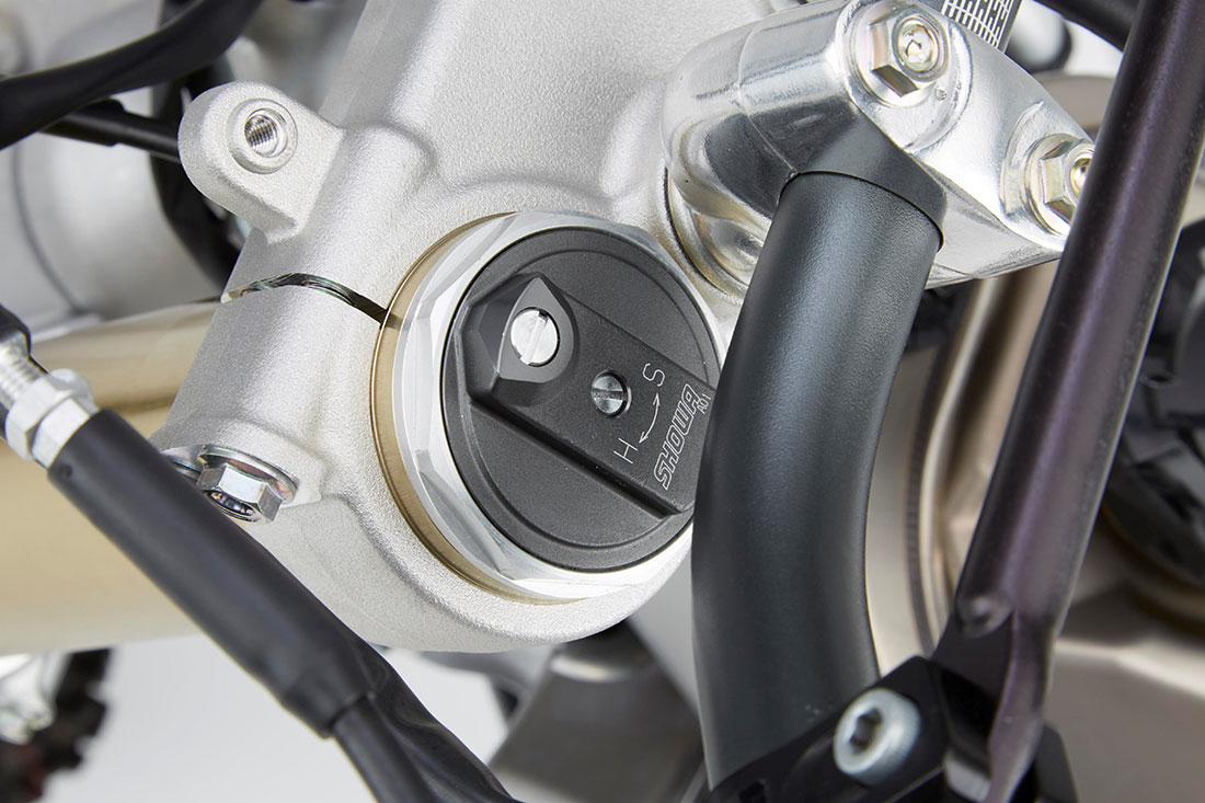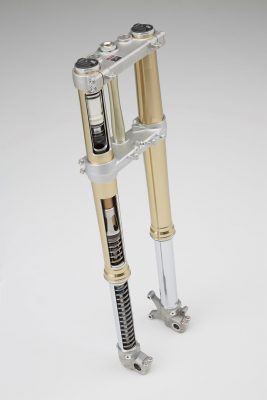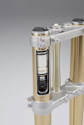 Ένα πιρούνι 49mm Showa USD – με ατσάλινα ελατήρια και εργοστασιακό εξοπλισμό αγωνιστικών προδιαγραφών με το οποίο εφοδιάζονται οι αγωνιστικές ομάδες ΜΧ στο Ιαπωνικό πρωτάθλημα αντικαθιστά το πνευματικό πιρούνι της KYB. Οι δύο δοκοί του αλουμινένιου πλαισίου είναι ειδικά σχεδιασμένες για μεγαλύτερη σταθερότητα στο εμπρός τμήμα και πρόσφυση, ενώ η 17YM CRF450R έχει πλήρως ανανεωμένη γεωμετρία. Το μεταξόνιο είναι μικρότερο, με πιο συμπαγές ψαλίδι και ρυθμιζόμενη γωνία κάστερ και ίχνος. Επίσης, έχει χαμηλότερο κέντρο βάρους χάρη στο ελαφρύτερο ρεζερβουάρ από τιτάνιο και της χαμηλότερα τοποθετημένης πάνω βάσης αμορτισέρ.