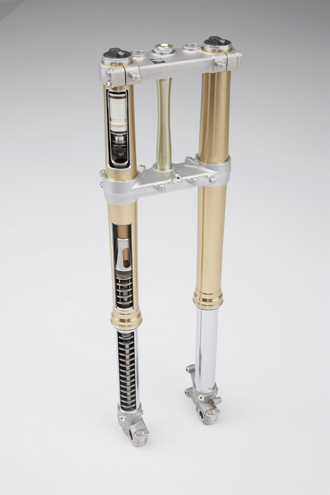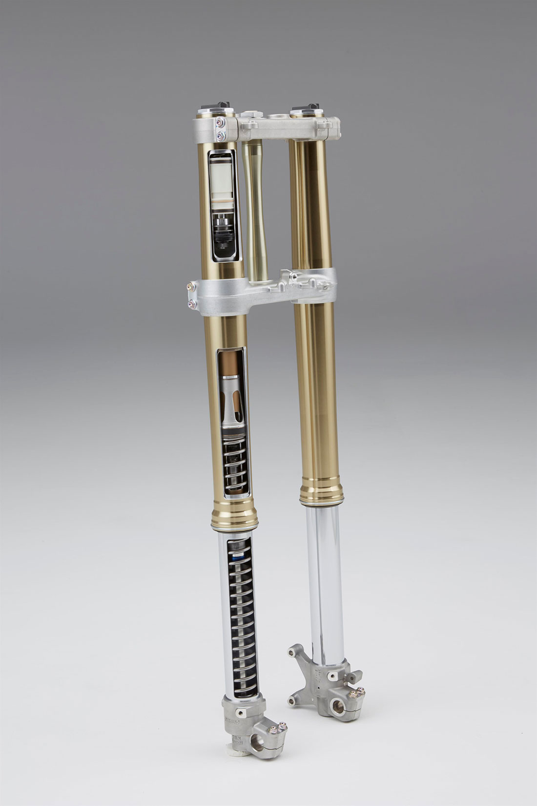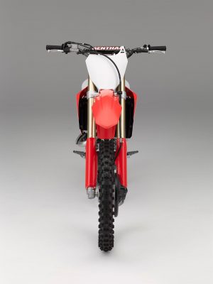 Η νέα μοτοσυκλέτα CRF450R εφοδιάζεται τώρα με ένα πλήρως προσαρμοζόμενο ανεστραμμένο τηλεσκοπικό πιρούνι 49mm της Showa USD με ελατήρια, έκδοση του εργοστασιακού πιρουνιού με την οποία εφοδιάζει η Showa τις αγωνιστικές ομάδες στο Ιαπωνικό εθνικό πρωτάθλημα ΜΧ. Δεν αποτελεί εξέλιξη του πιρουνιού 48mm που είχε τοποθετηθεί τελευταία φορά στο μοντέλο 14YM, με το οποίο διαφέρει από κάθε άποψη: ο κύλινδρος έχει διάμετρο 25mm αντί 24mm, η ράβδος 14mm (12.5mm) και το έμβολο συμπίεσης 39mm (37mm). Όπως σε μία ανάρτηση αγωνιστικών προδιαγραφών, το πιρούνι προσφέρει ομαλή λειτουργία και απόλυτο έλεγχο.