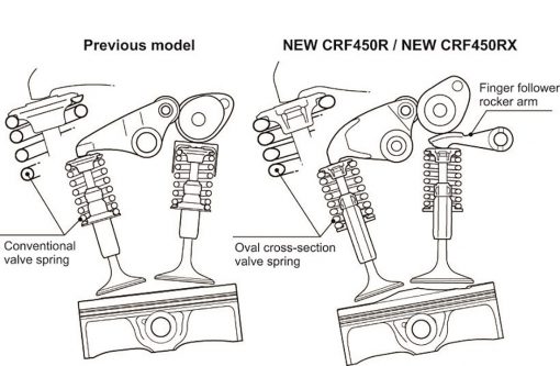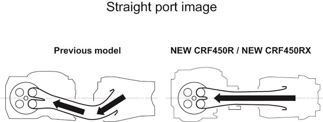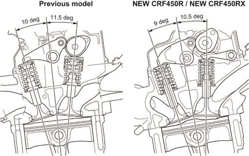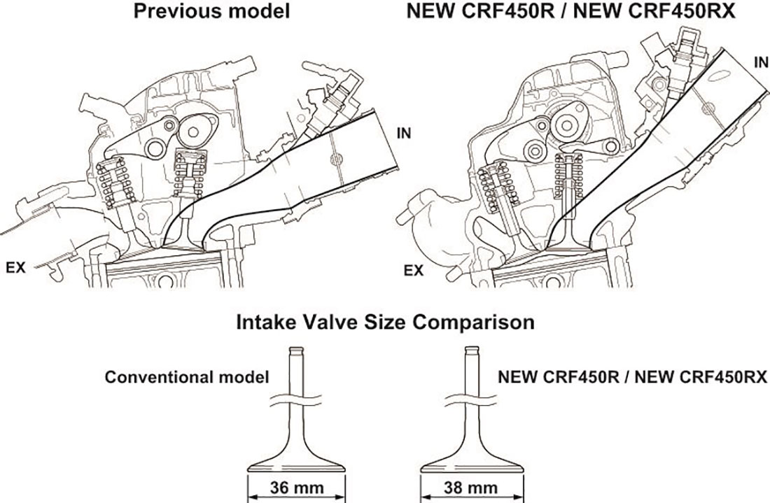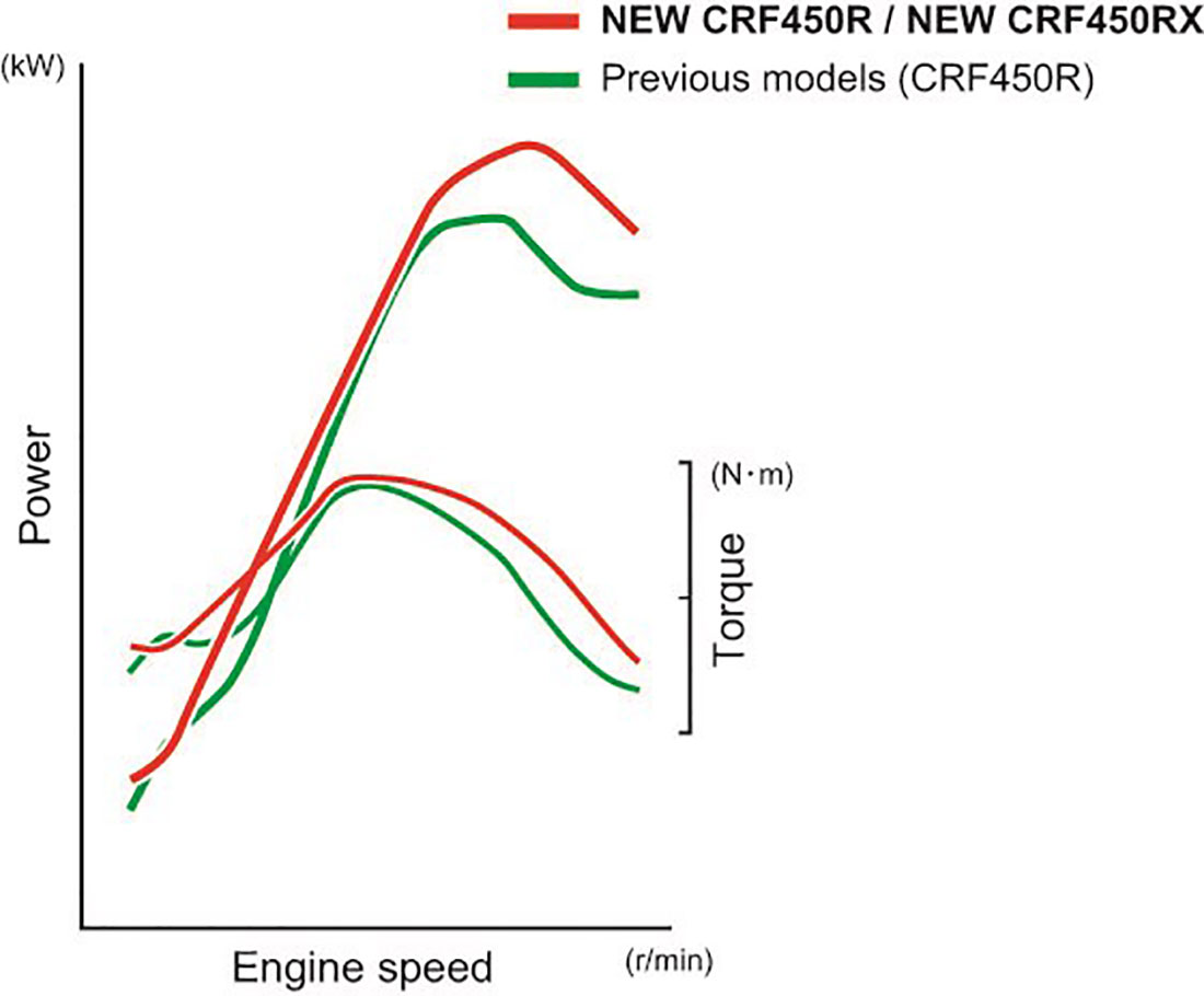 Ο κινητήρας 449cc του μοντέλου CRF450R προσφέρει τώρα 11% βελτιωμένη μέγιστη ισχύ συγκριτικά με το προηγούμενο μοντέλο. Οι καμπύλες ισχύος και ροπής των 16YM και 17YM απεικονίζουν σχηματικά το όφελος επιδόσεων της νέας σχεδίασης: είναι παντού ισχυρότερος, αλλά κυρίως στη μεσαία περιοχή στροφών και στο πάνω άκρο, με σημαντική αύξηση των μέγιστων στροφών.