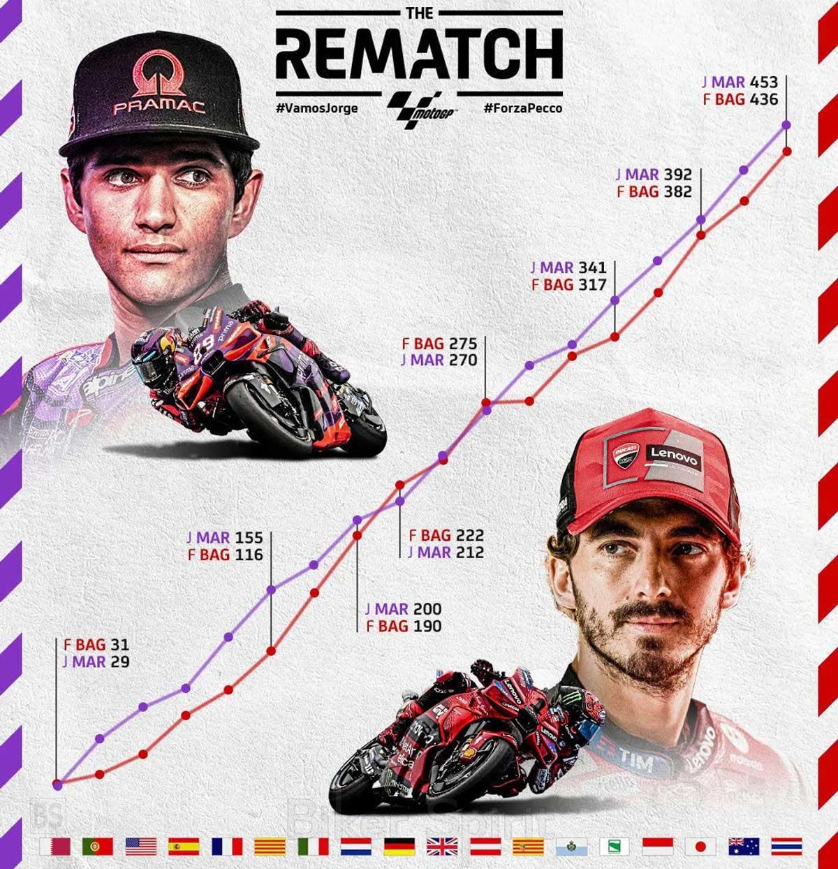 Για άλλη μια φορά, αυτοί οι δύο αναβάτες κυριάρχησαν το 2024, όπως έκαναν και πέρυσι, όταν ο τίτλος κρίθηκε στο νήμα. Το 2023, ο Bagnaia κράτησε το προβάδισμα στον τελευταίο αγώνα και θριάμβευσε με μια αποφασιστική νίκη καθώς ο Martin είχε πτώση. Φέτος, ωστόσο, οι ρόλοι αντιστρέφονται. Ο Martin φτάνει με ένα επιβλητικό πλεονέκτημα 24 βαθμών!