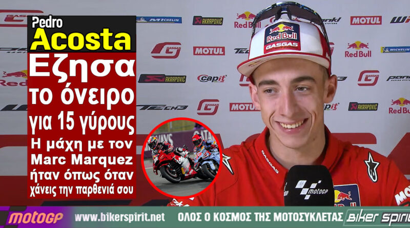 MotoGP 2024 Pedro Acosta: “Έζησα το όνειρο για 15 γύρους – Η μάχη με τον Marquez ήταν όπως όταν χάνεις την παρθενιά σου, όλα αρχίζουν όμορφα και καταλήγουν σε καταστροφή” 11 March 2024 BikerSpirit #QatarGP, #QatarGP2024, Losail, MotoGP, MotoGP2023, Qatar, Καταρ 4 min read Share this: Share on Facebook (Opens in new window) Facebook Share on X (Opens in new window) X Share on LinkedIn (Opens in new window) LinkedIn Print (Opens in new window) Print More Share on Reddit (Opens in new window) Reddit Share on Tumblr (Opens in new window) Tumblr Share on Pinterest (Opens in new window) Pinterest Read More