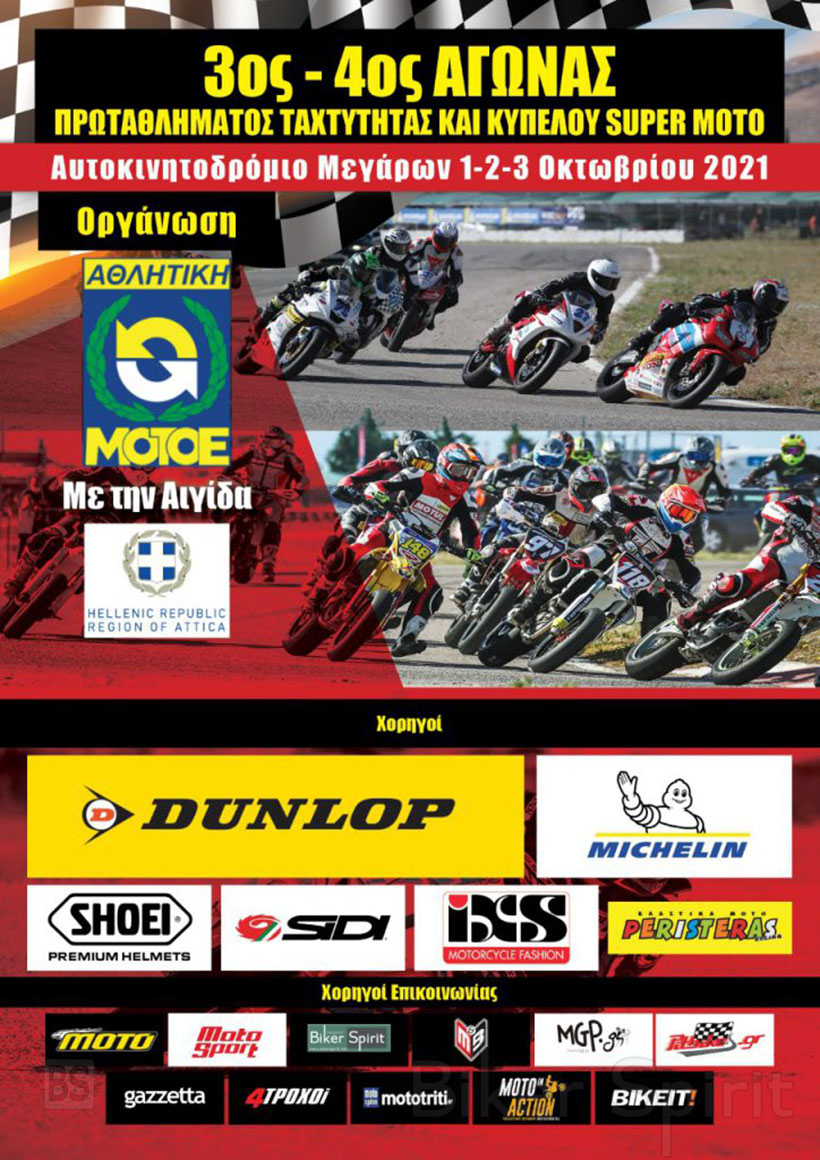 Θα γίνουν ο 3ος και 4ος αγώνας για το Πανελλήνιο Πρωτάθλημα Ταχύτητας 1-2-3 Οκτωβρίου στο Αυτοκινητοδρόμιο Μεγάρων καθώς και ο 3ος και 4ος αγώνας για το Κύπελλο Super Moto 2-3 Οκτωβρίου 2021 επίσης στο Αυτοκινητοδρόμιο Μεγάρων.