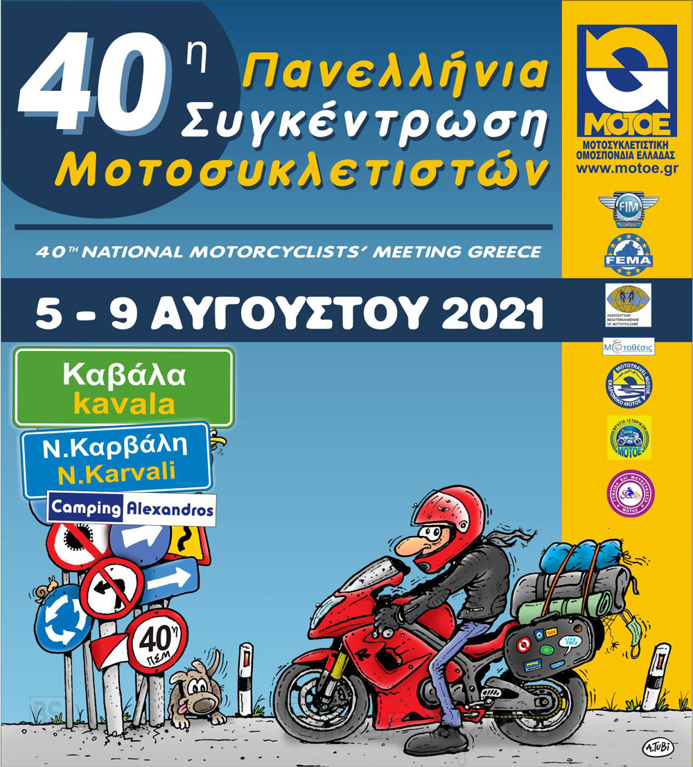 Το Δ.Σ. της ΜΟΤΟΕ ανακοινώνει πως η 40ή Πανελλήνια θα γίνει στις 5 έως 9 Αυγούστου 2021 στο Camping Αλέξανδρος στην Νέα Καρβάλη Καβάλας, σύμφωνα με τα τότε ισχύοντα πρωτόκολλα.