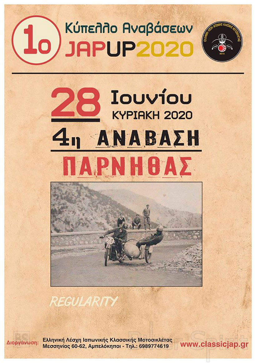 Την Κυριακή 28 Ιουνίου 2020 θα γίνει η 3η Ανάβαση ( Regularity ) για το 1ο Κύπελλο JAP UP 2020, που διοργανώνεται από την Ελληνική Λέσχη Ιαπωνικής Κλασικής Μοτοσυκλέτας.