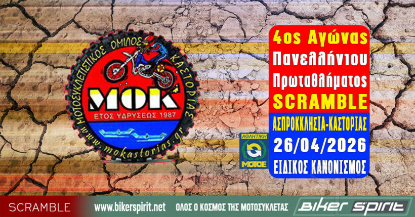 Το αθλητικό σωματείο Μοτοσυκλετιστικός Όμιλος Καστοριας – A.Μ.Ο.K, με αριθμό Αθλητικής Αναγνώρισης ΦΜ06 μετά από έγκριση της Α.ΜΟΤ.Ο.Ε διοργανώνει την Κυριακή, 26 Απριλιου 2026 τον 4ο αγωνα Πανελληνιου Scramble για το έτος 2026