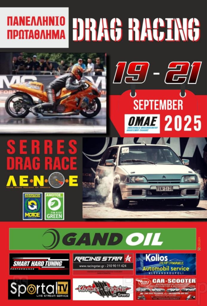 Το αθλητικό σωματείο ΛΕΝΟΕ σε συνεργασία με την ΟΜΑΕ και την ΑΜΟΤΟΕ διοργανώνει τον 4ο αγώνα «ΠΡΩΤΑΘΛΗΜΑΤΟΣ ΜΟΤΟΣΥΚΛΕΤΩΝ DRAGSTER 2025» στις 19 με-21 Σεπτεμβρίου 2025 στο Αυτοκινητοδρόμιο Σερρών