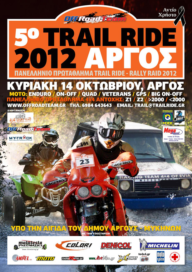 Το Πανελλήνιο Πρωτάθλημα Rally Raid – Trail Ride 2012 καθώς και το Πρωτάθλημα Αντοχής 4Χ4 συνεχίστηκε στο Άργος για τον 5ο αγώνα του, στις 14 Οκτωβρίου. Σε έναν αγώνα μικρό και όμορφο, που κόντρα στο καιρό, συγκέντρωσε όλα τα καλά χαρακτηριστικά ενός «μεγάλου» αγώνα!