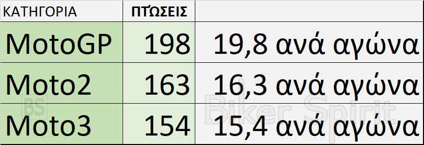 Συνολικά 198 πτώσεις καταγράφηκαν για την κατηγορία MotoGP στα πρώτα δέκα Grand Prix, κατά μέσο όρο 19,8 ανά αγώνα το Σαββατοκύριακο.