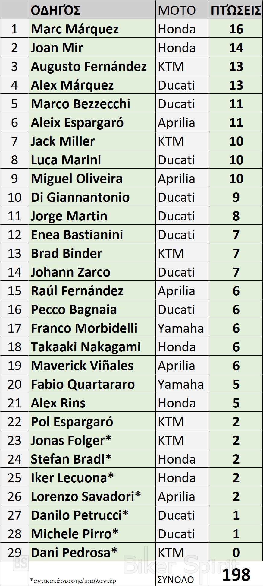 Οι οδηγοί της Repsol Honda έχουν πληγεί περισσότερο μέχρι στιγμής: ο Marc Márquez είναι στην κορυφη με 16 πτώσεις, παρόλο που έχει χάσει εντελώς το Grand Prix στο Las Termas, στο Austin και στη Jerez μετά από τραυματισμό στον αντίχειρα στο Portimão, επίσης έχασε τους κύριους αγώνες στο Sachsenring και στο Assen.