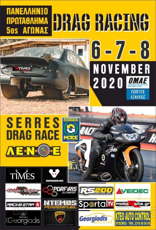 Η ΛΕ.Ν.Ο.Ε οργανώνει, τον 5ο Αγώνα του Πανελλήνιου Πρωταθλήματος Μοτοσυκλέτας DRAGSTER 2020R, την 6-7-8 Νοεμβρίου 2020 στο Αυτοκινητοδρόμιο Σερρών