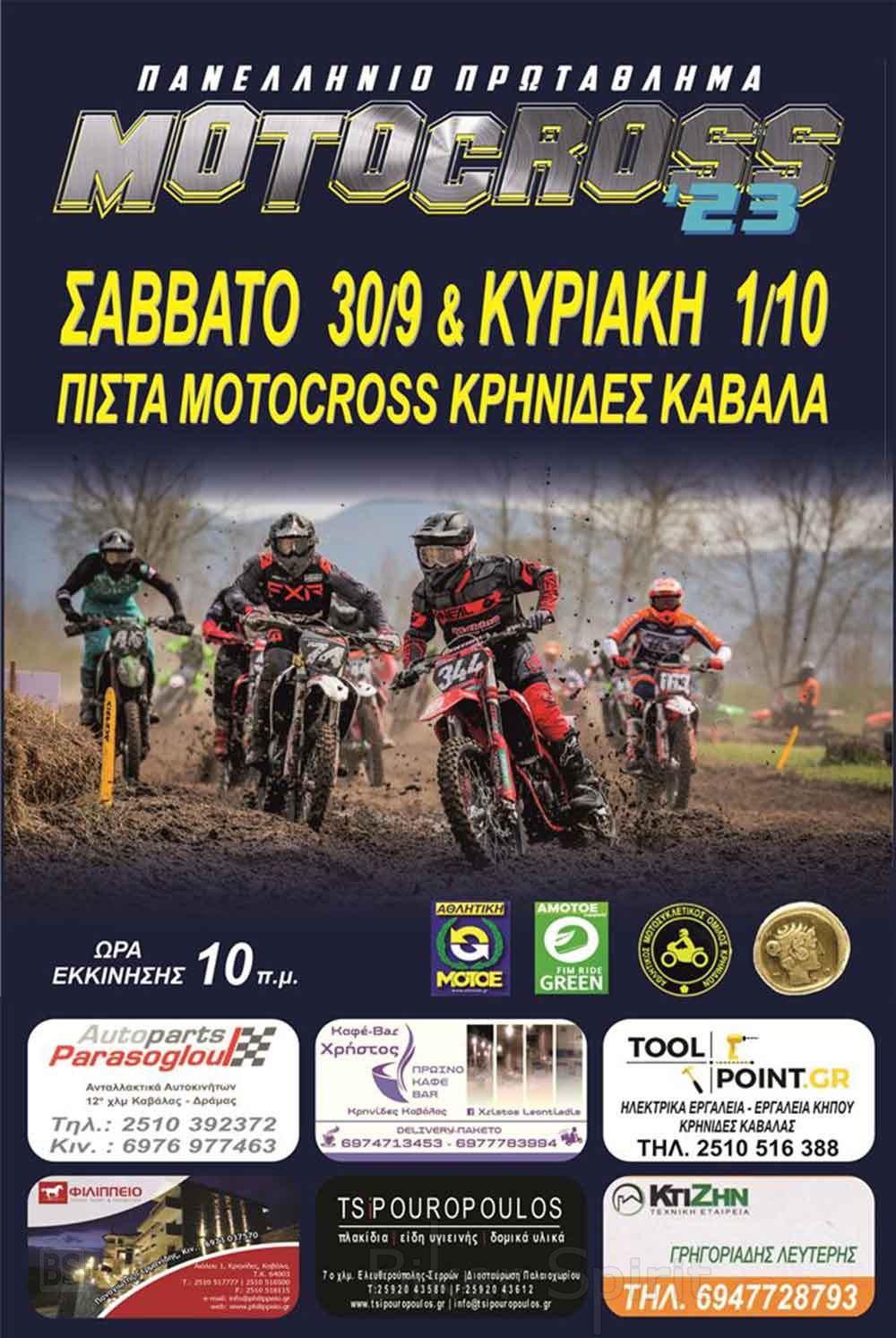 Το αθλητικό σωματείο ΑΜΟ ΚΡΗΝΙΔΩΝ, διοργανώνει τον 6ο Αγώνα του Πανελληνίου Πρωταθλήματος Motocross 2023, στην Καβάλα στις 30/09 και 01/10/2023.