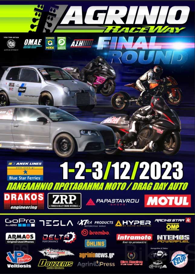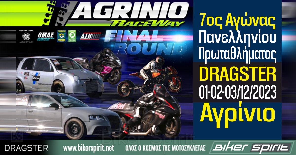O Α.Σ.Η. διοργανώνει, τον 7ο αγώνα Πανελληνίου Πρωταθλήματος μοτοσυκλετών DRAGSTER 2023 στο στρατιωτικό αεροδρόμιο Αγρινίου στις 01-02-03/12/2023.