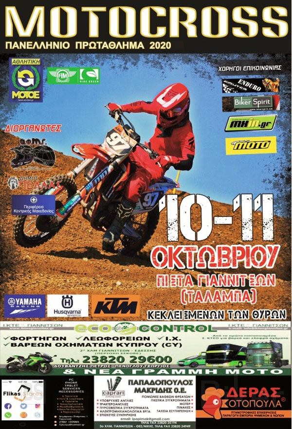 Η αυλαία του Πανελληνίου Πρωταθλήματος Motocross για το 2020 πέφτει στα Γιαννιτσά αυτό το Σαββατοκύριακο 10-11 Οκτωβρίου, κεκλεισμένων των θυρών, με τον 7ο αγώνα που διοργανώνει το αθλητικό σωματείο Ο.Φ.Μ.Γ. και θα γίνει στην πίστα Motocross MX PARK GIANNITSA.
