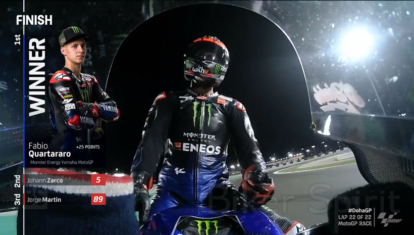 Ο Fabio Quartararo (Monster Energy Yamaha MotoGP) εκμεταλλεύτηκε τη σταθερή πρόσφυση του ελαστικού MICHELIN Power Slicks Soft, για να κερδίσει το δεύτερο φετινό αγώνα του παγκόσμιου πρωταθλήματος MotoGP ™, Tissot Grand Prix της Ντόχα, μπροστά από το συμπατριώτη του Johann Zarco (Pramac Racing). Ο αγώνας του περασμένου Σαββατοκύριακου ήταν αρκετά σφιχτός , με τους δέκα κορυφαίους αναβάτες, περνώντας τη γραμμή του τερματισμού να έχουν μόλις 9.288 δευτερόλεπτα διαφορά μεταξύ τους κι ο αγώνας αυτού του Σαββατοκύριακου ήταν ακόμη πιο συναρπαστικός, με τους 15 κορυφαίους αναβάτες να έχουν διαφορά μόλις 8.928 δευτερόλεπτα, η μικρότερη διαφορά που έχει καταγραφεί ποτέ!