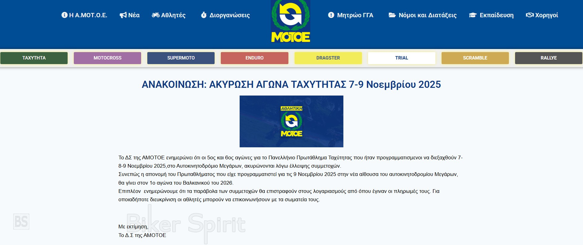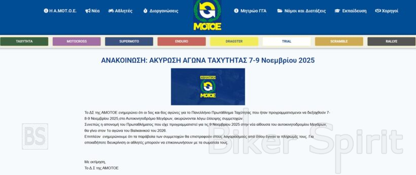 Με έναν άδοξο και στενάχωρο τρόπο έπεσε φέτος η αυλαία του Πανελληνίου Πρωταθλήματος Ταχύτητας, αφού η ΑΜΟΤΟΕ ανακοίνωσε σήμερα, 5 Νοεμβρίου 2025, πως οι δύο τελευταίοι αγώνες στα Μέγαρα, που ήταν προγραμματισμένοι για 7 με 9 Νοεμβρίου, ακυρώνονται λόγω έλλειψης συμμετοχών.