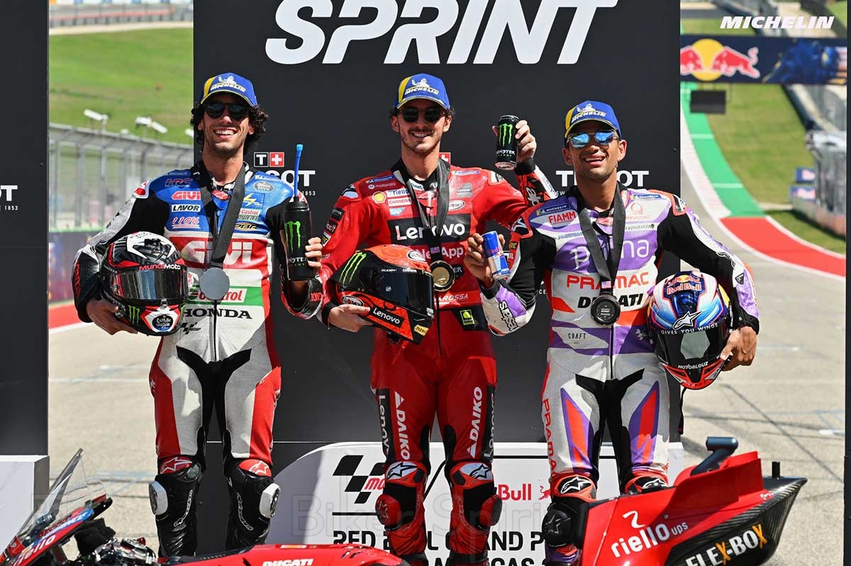 «Είχαμε διαφορετικές συνθήκες στον αγώνα σπριντ από ό,τι στις δοκιμές», εξήγησε ο Rins χαρούμενος. «Ήταν θεαματικό. Κάναμε έναν φανταστικό αγώνα. Έκανα κάποια λάθη πίσω από τον Pecco στους πρώτους γύρους. Άνοιγα πολύ και δεν μπορούσα να σταματήσω την μοτοσυκλέτα. Έκανε τόσο ζέστη που μπλόκαρε απίστευτα το μπροστινό, αλλά αργότερα, όταν με πρόλαβε ο Aleix την πρώτη φορά, πίεσα για να μην φύγουν και κόντεψα να πέσω στη στροφή 15. Έσωσα ένα καλό από μπροστά. Είμαι πολύ περήφανος, πολύ περήφανος, γιατί κατάφερα να κρατήσω τον ρυθμό μου. Είναι το πρώτο βάθρο με τη Honda και θα πιέσω περισσότερο αύριο»,