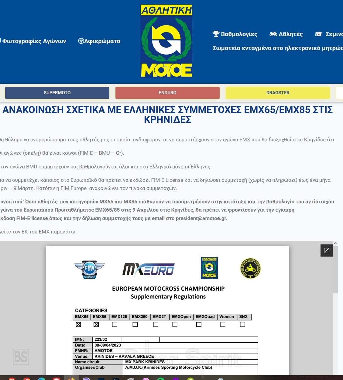 Ανακοίνωση της ΑΜΟΤΟΕ σχετικά με Ελληνικές συμμετοχές ΕΜΧ65/ΕΜΧ85 στον αγώνα FIM-E – BMU στις Κρηνίδες