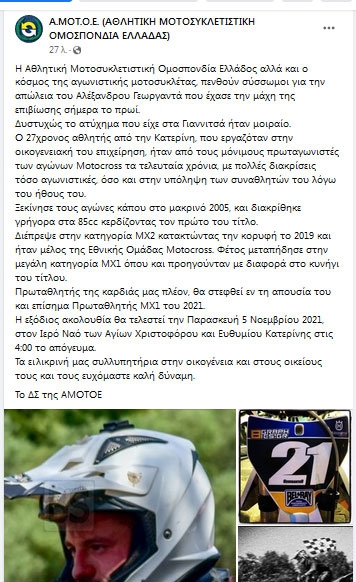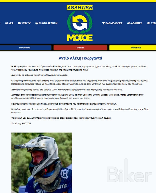 Η Αθλητική Μοτοσυκλετιστική Ομοσπονδία Ελλάδος αλλά και ο κόσμος της αγωνιστικής μοτοσυκλέτας, πενθούν σύσσωμοι για την απώλεια του Αλέξανδρου Γεωργαντά που έχασε την μάχη της επιβίωσης σήμερα το πρωί.
