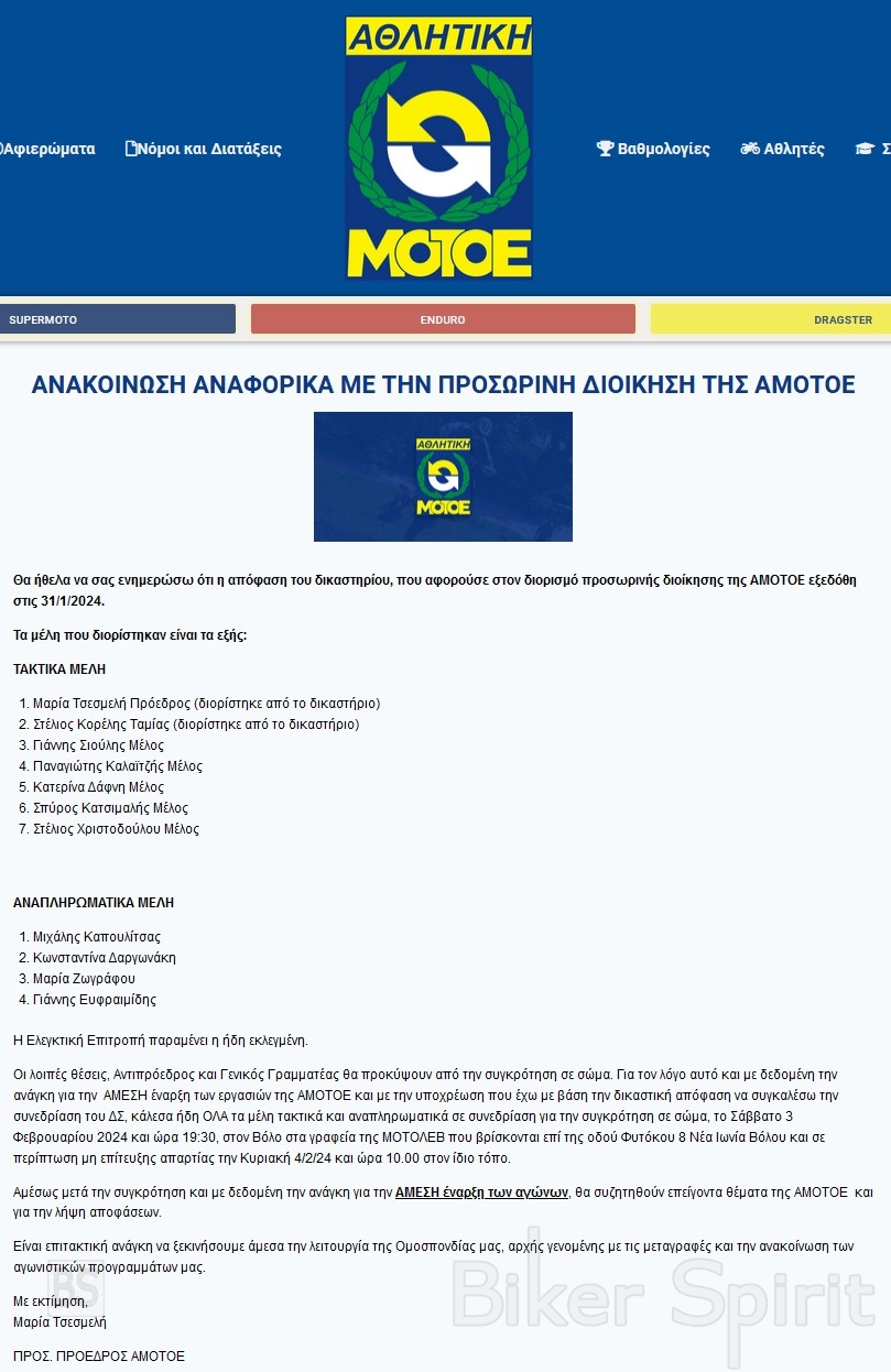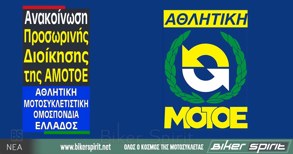 Μετά την έκπτωση του Διοικητικού Συμβουλίου της ΑΜΟΤΟΕ ΑΘΛΗΤΙΚΗ ΜΟΤΟΣΥΚΛΕΤΙΣΤΙΚΗ ΟΜΟΣΠΟΝΔΙΑ ΕΛΛΑΔΟΣ» που αποφάσισε η Γενική Γραμματεία Αθλητισμού στις 13 Δεκεμβρίου 2023, το δικαστήριο διόρισε προσωρινής διοίκησης της ΑΜΟΤΟΕ όπως ράφει η ανακοίνωση της προσορινής Προέδρου της ΑΜΟΤΟΕ.