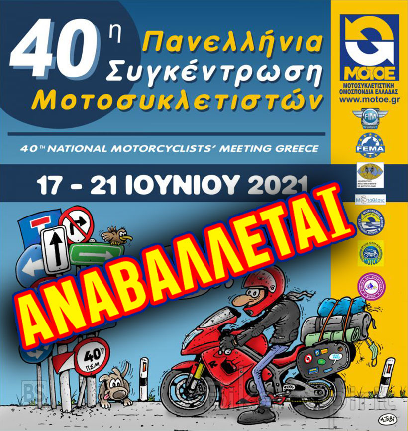 Η ΜΟΤ.Ο.Ε. ανακοινώνεται με μια ανακοίνωση στο Facebook ότι η 40η Πανελλήνια Συγκέντρωση Μοτοσυκλετιστών 2021 δεν θα γινει την προκαθορισμένη ημερομηνία που είχε οριστεί αρχικώς (το τριήμερο του Αγίου Πνεύματος, από 17 έως 21 Ιουνίου 2021) και ότι ο τόπος και ο χρόνος διεξαγωγής της θα ανακοινωθούν το συντομότερο δυνατόν.