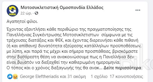 Έχοντας εξαντλήσει κάθε περιθώριο της πραγματοποίησης της Πανελλήνιας Συγκέντρωσης Μοτοσυκλετιστων σύμφωνα με τις τρέχουσες διατάξεις και ΦΕΚ, και έχοντας διερευνήσει κάθε πιθανή (ή και απίθανη) δυνατότητα εξεύρεσης κατάλληλων προϋποθέσεων, με λύπη, και παρά τις μέχρι και σήμερα προσπάθειες, βρισκόμαστε στην δυσάρεστη θέση να ανακοινώσουμε πως η Πανελλήνια δεν είναι δυνατόν να διεξαχθεί την καθιερωμένη ημερομηνία.