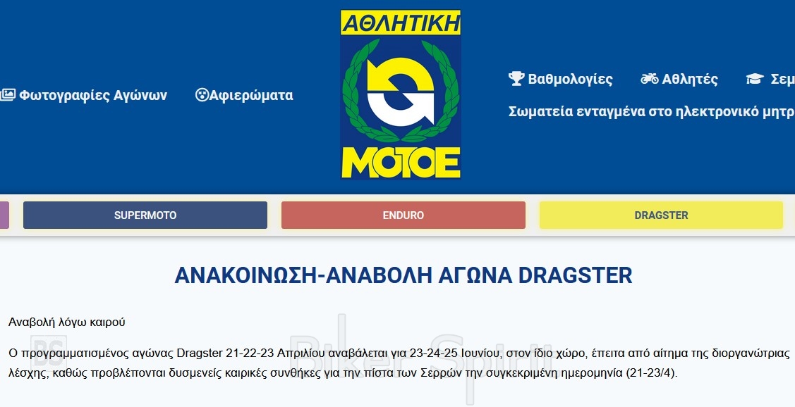 Ο προγραμματισμένος αγώνας Dragster 21-22-23 Απριλίου αναβάλεται για 23-24-25 Ιουνίου, στον ίδιο χώρο, έπειτα από αίτημα της διοργανώτριας λέσχης, καθώς προβλέπονται δυσμενείς καιρικές συνθήκες για την πίστα των Σερρών την συγκεκριμένη ημερομηνία (21-23/4).