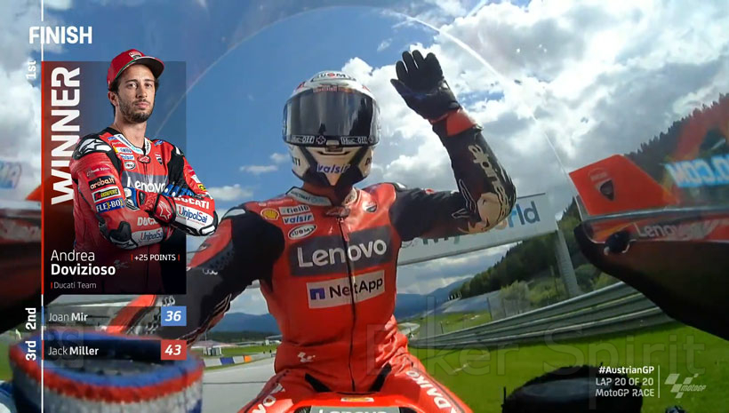 Παρουσιάζοντας στο ημερολόγιο από το 2016 η αυστριακή πίστα συνεχίζει να είναι ευνοϊκή όχι μόνο για τα χαρακτηριστικά της μοτοσυκλέτας Desmosedici GP, αλλά και για το στυλ οδήγησης του Andrea Dovizioso, ο οποίος στις τελευταίες πέντε αγώνες του Grand Prix κατάφερε πάντα να ανεβεί στο βάθρο. Με την πρόσφατη νίκη του την περασμένη Κυριακή, οι νίκες του στην Αυστρία έγιναν 3, μαζί με τη δεύτερη και τρίτη θέση το 2016 και το 2018 αντίστοιχα. Στο Styria Grand Prix, ο Andrea θα στοχεύσει να συνεχίσει αυτήν την εξαιρετική σειρά επιτυχιών στην πίστα του Spielberg και να πλησιάσει στην κορυφή της γενικής κατάταξης, η οποία τον βλέπει στη δεύτερη θέση, 11 βαθμούς πίσω από τον Quartararo.