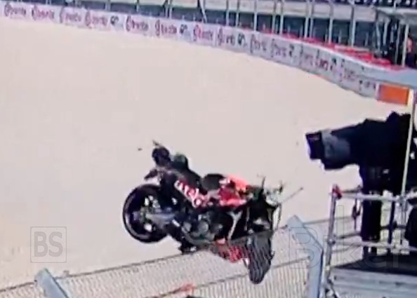 Η μοτοσυκλέτα των 157 κιλών γλίστρησε με μεγάλη ταχύτητα στην αμμοπαγίδα και τελικά εκτοξεύτηκε πάνω από τις μπαριέρες, καταλήγοντας στην πλατφόρμα που βρισκόταν τοποθετημένος ο Joao, ο εικονολήπτης της Dorna που κάλυπτε τη συγκεκριμένη στροφή.