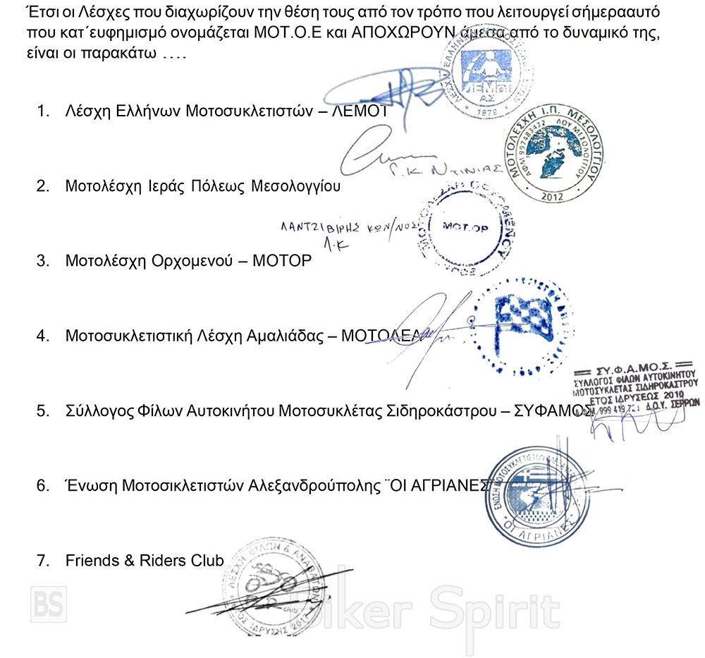 ΔΕΛΤΙΟ ΤΥΠΟΥ: Σε συνέχεια της πρόσφατης αποχώρησης των εκπροσώπων 4 Μοτοσυκλετιστικών Λεσχών από το Δ.Σ. της ΜΟΤ.Ο.Ε, και της δημόσιας καταγγελίας για τον αναποτελεσματικό και αδιαφανή τρόπο που αυτή λειτουργεί τα τελευταία χρόνια, (δείτε εδώ σχετικά >>>), οι πρώτες 7 Μοτοσυκλετιστικές Λέσχες ταυτίζονται με το σκεπτικό και τις καταγγελίες μας και συμπορεύονται.