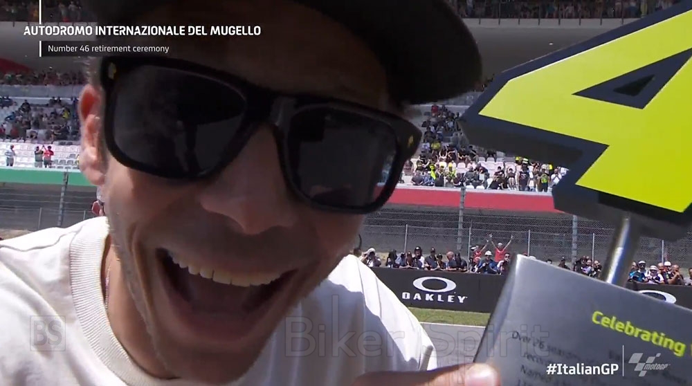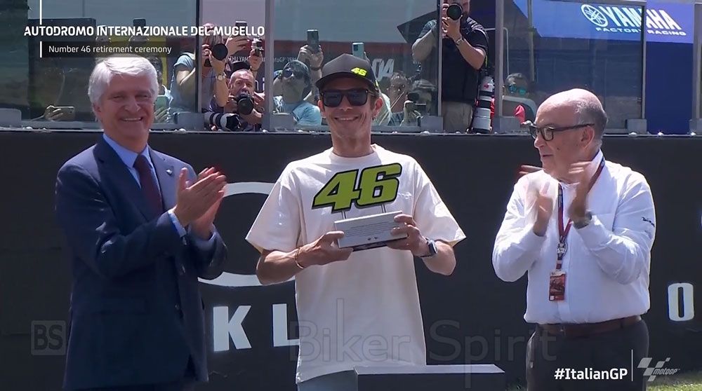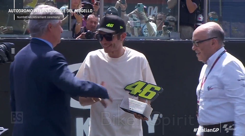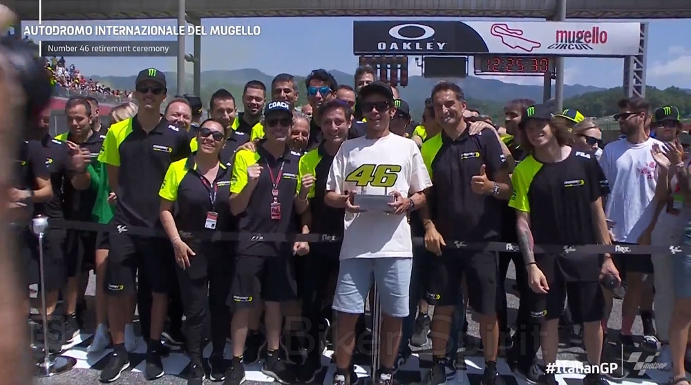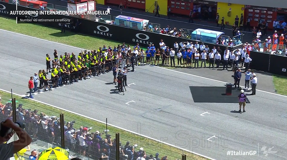 Στην ευθεία εκκίνησης – τερματισμού της πίστας του Mugello, ο θρύλος του MotoGP, Valentino Rossi, μαζί με τον Carmelo Ezpeleta και τον πρόεδρο της FIM, πραγματοποίησαν μια μικρή τελετή προς τιμήν της εξαιρετικής καριέρας με εννέα Παγκόσμια Πρωταθλήματα, 115 νίκες και 235 βάθρα σε όλες τις κατηγορίες του Ιταλού που αγαπήθηκε όσο κανένας, αντιπροσωπεύοντας ένα απίστευτο είδωλο για το παγκόσμιο πρωτάθλημα.