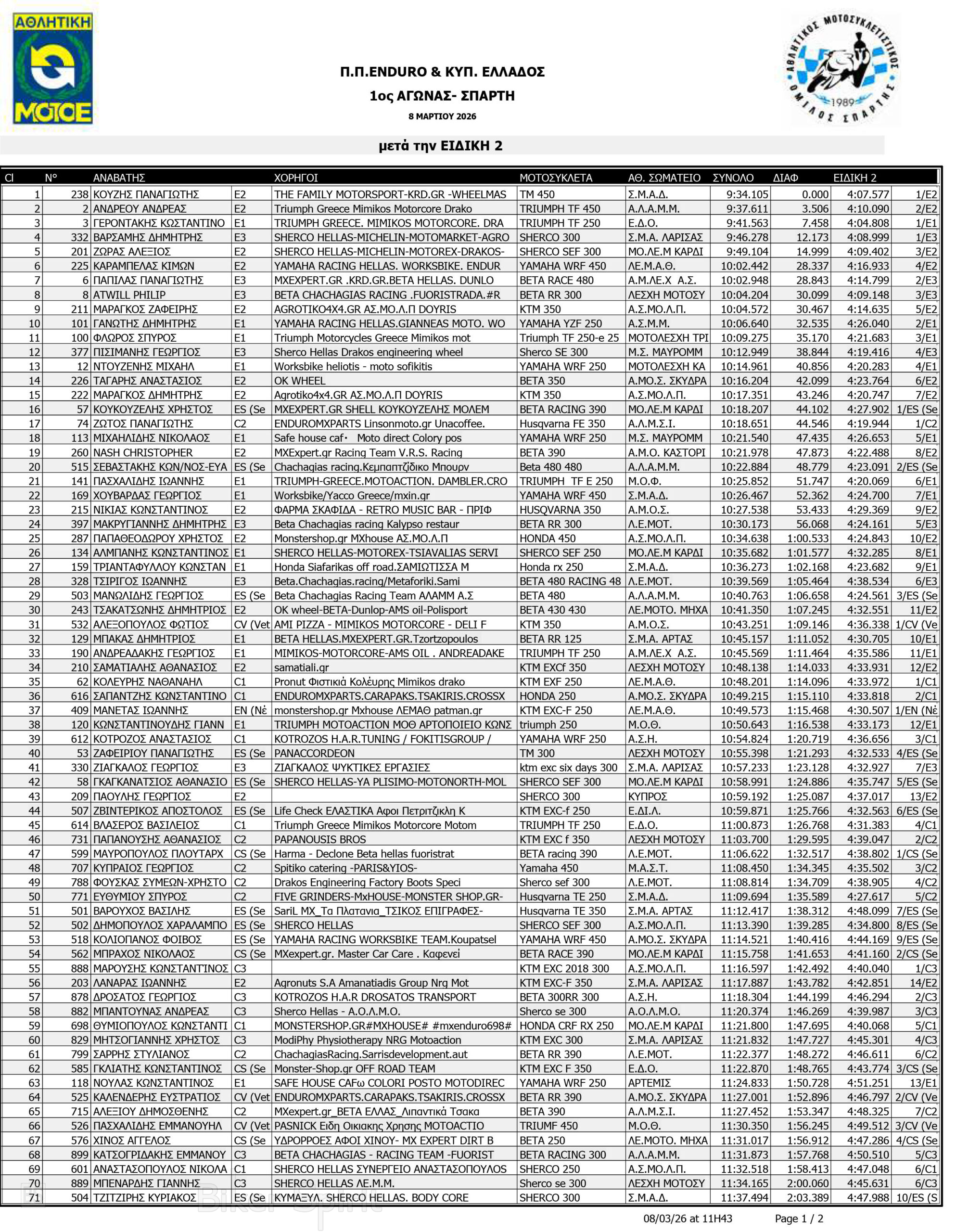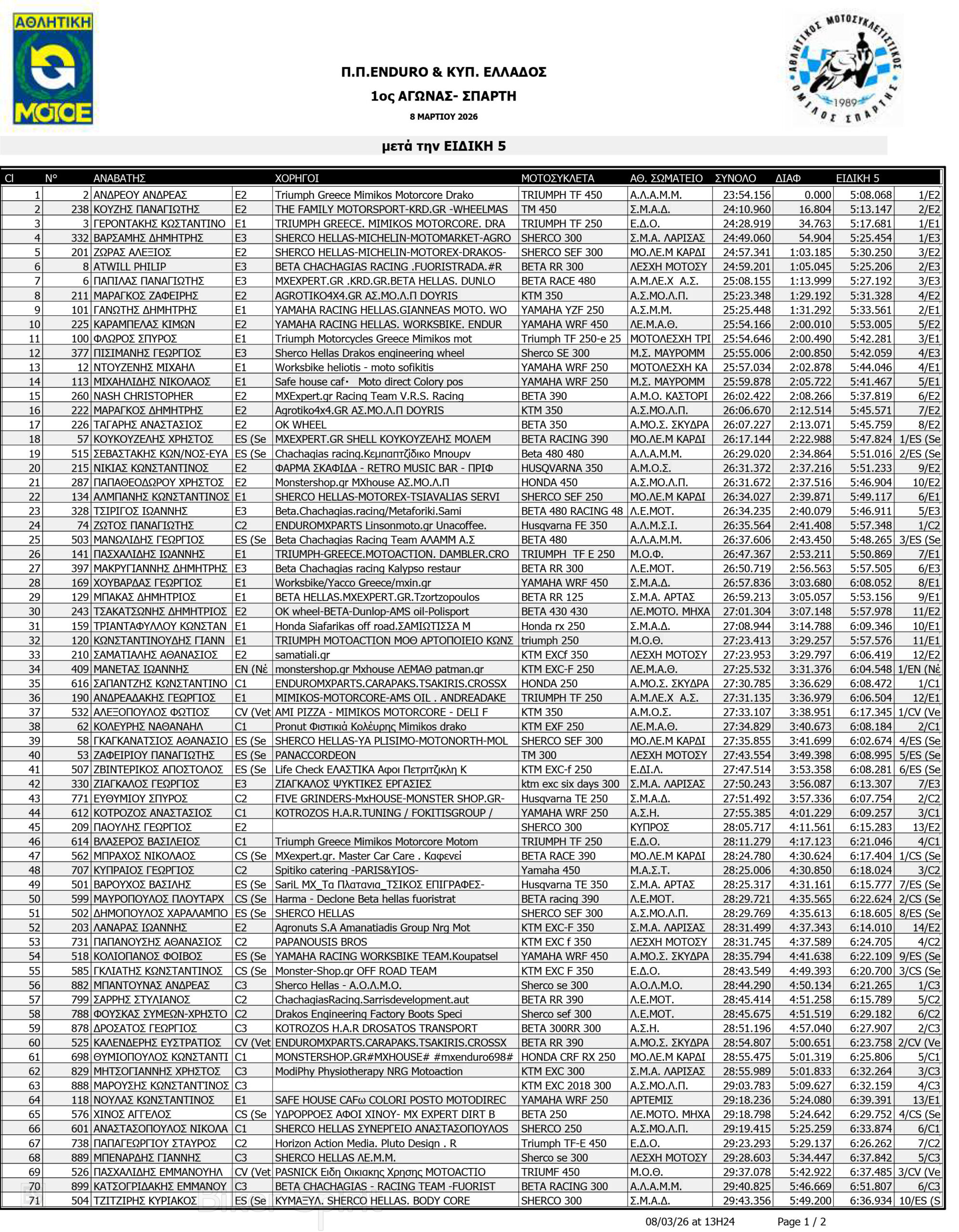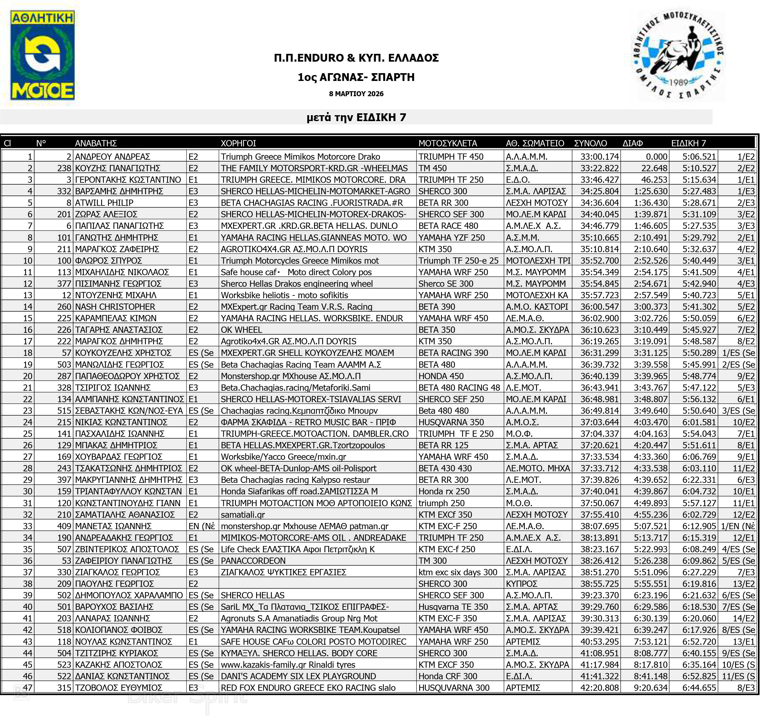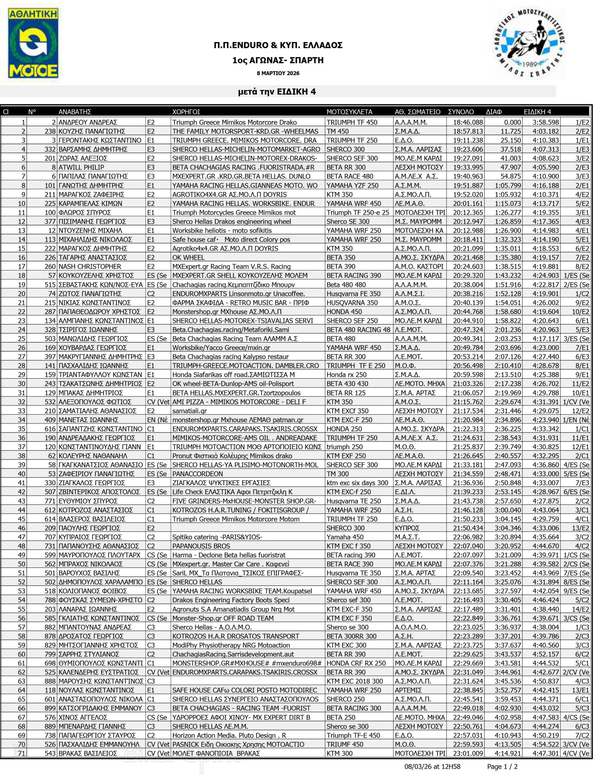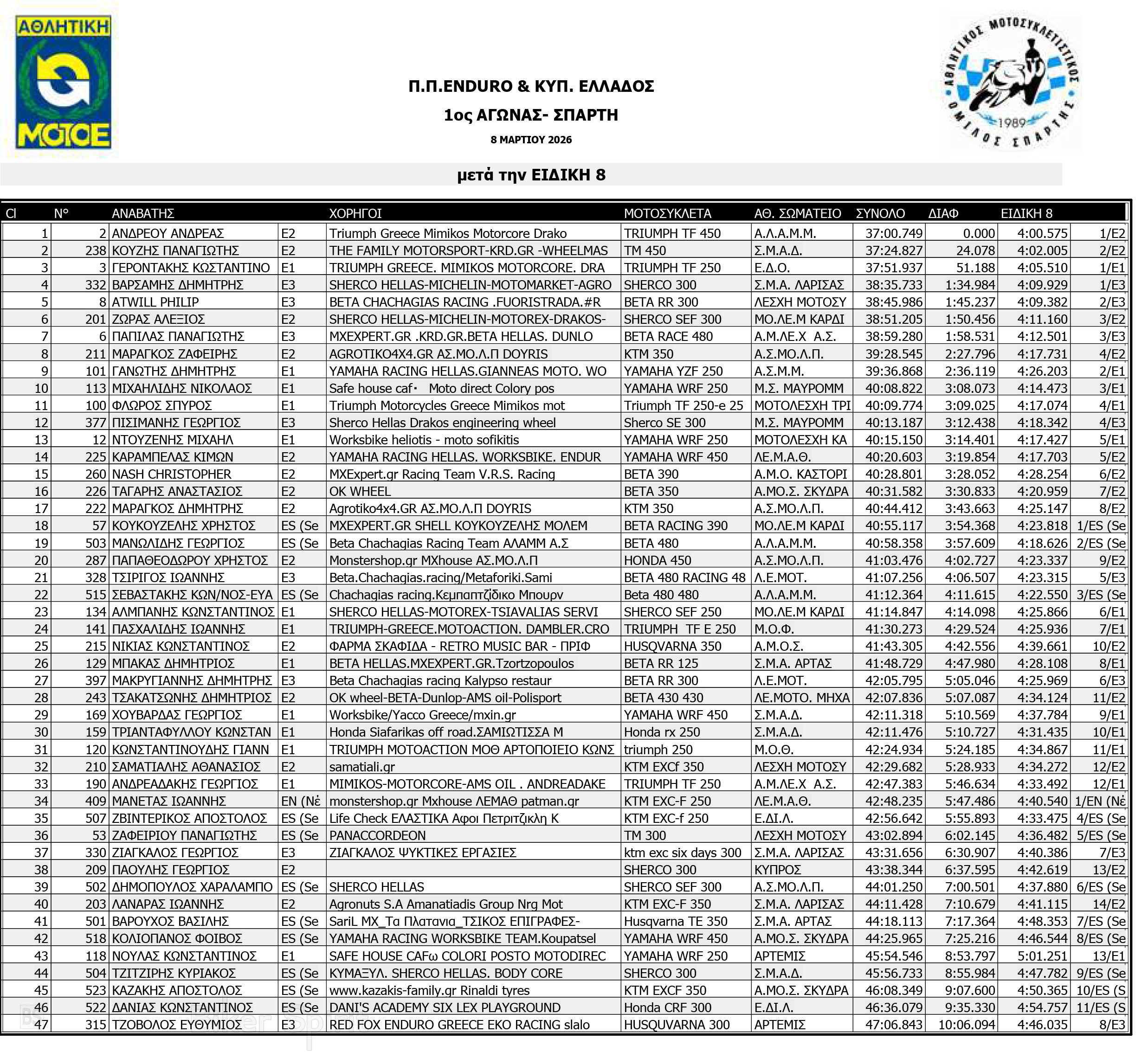 ΑΠΟΤΕΛΕΣΜΑΤΑ: 1ου αγώνα για το Πανελλήνιο Πρωτάθλημα Enduro και Κύπελλο Enduro 2026 – Σπάρτη