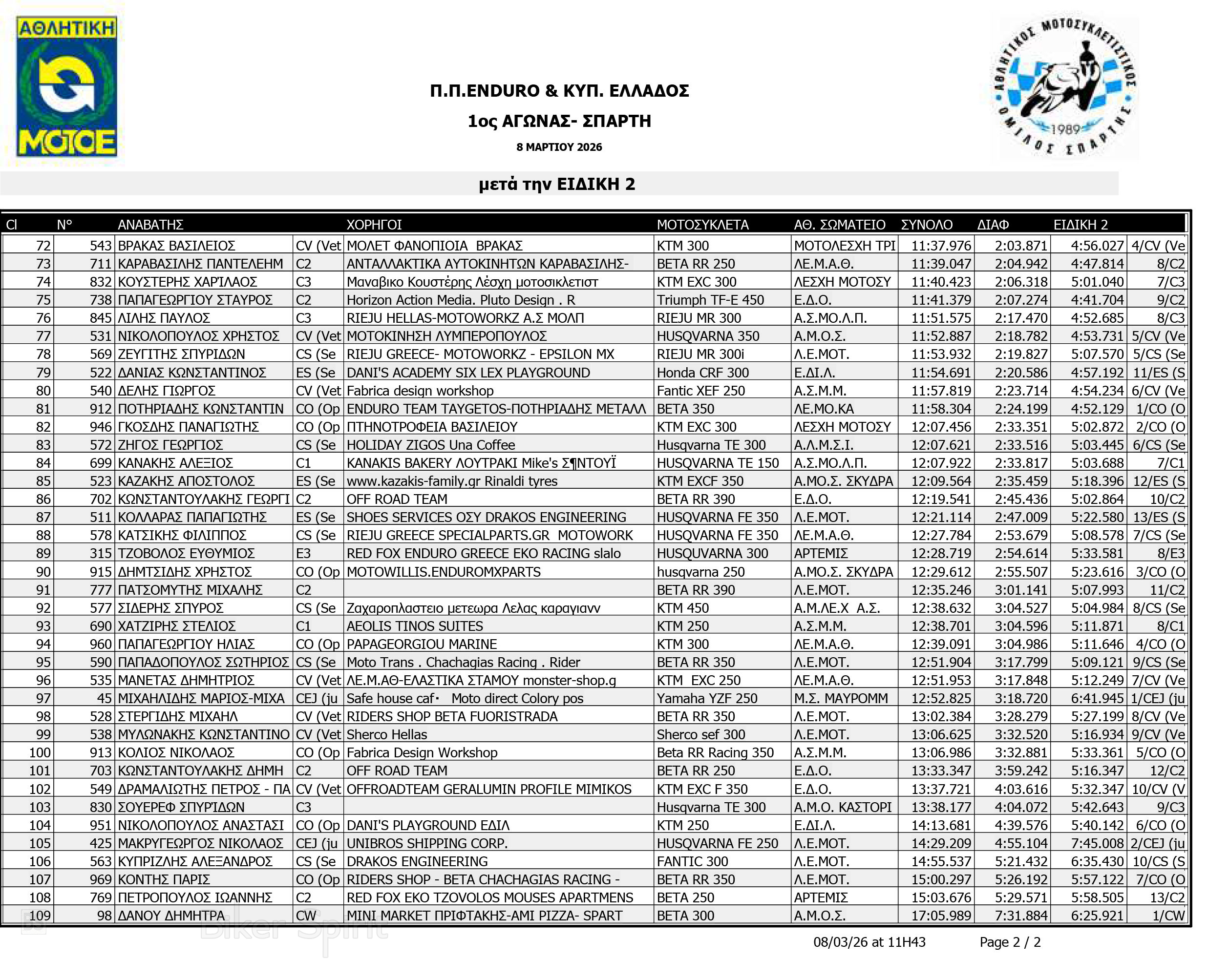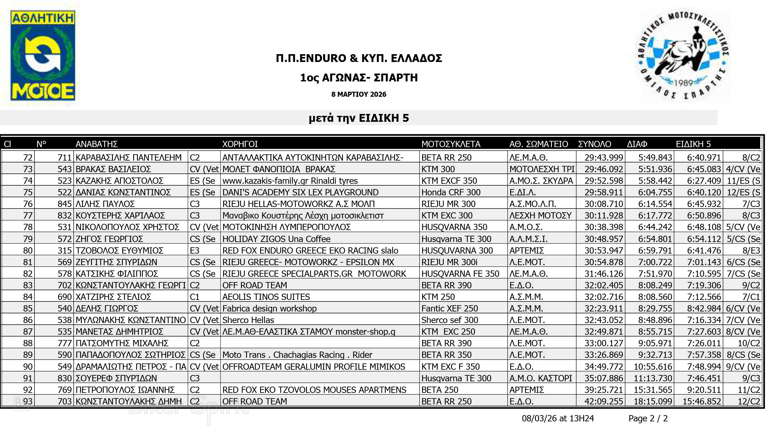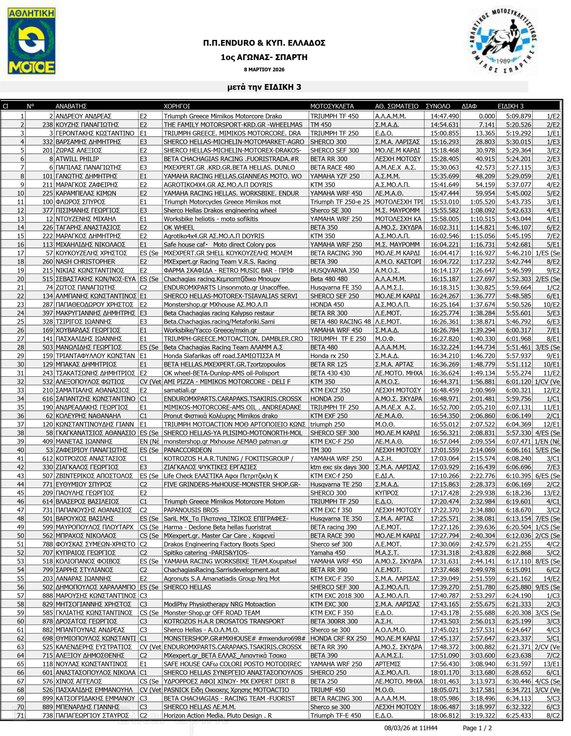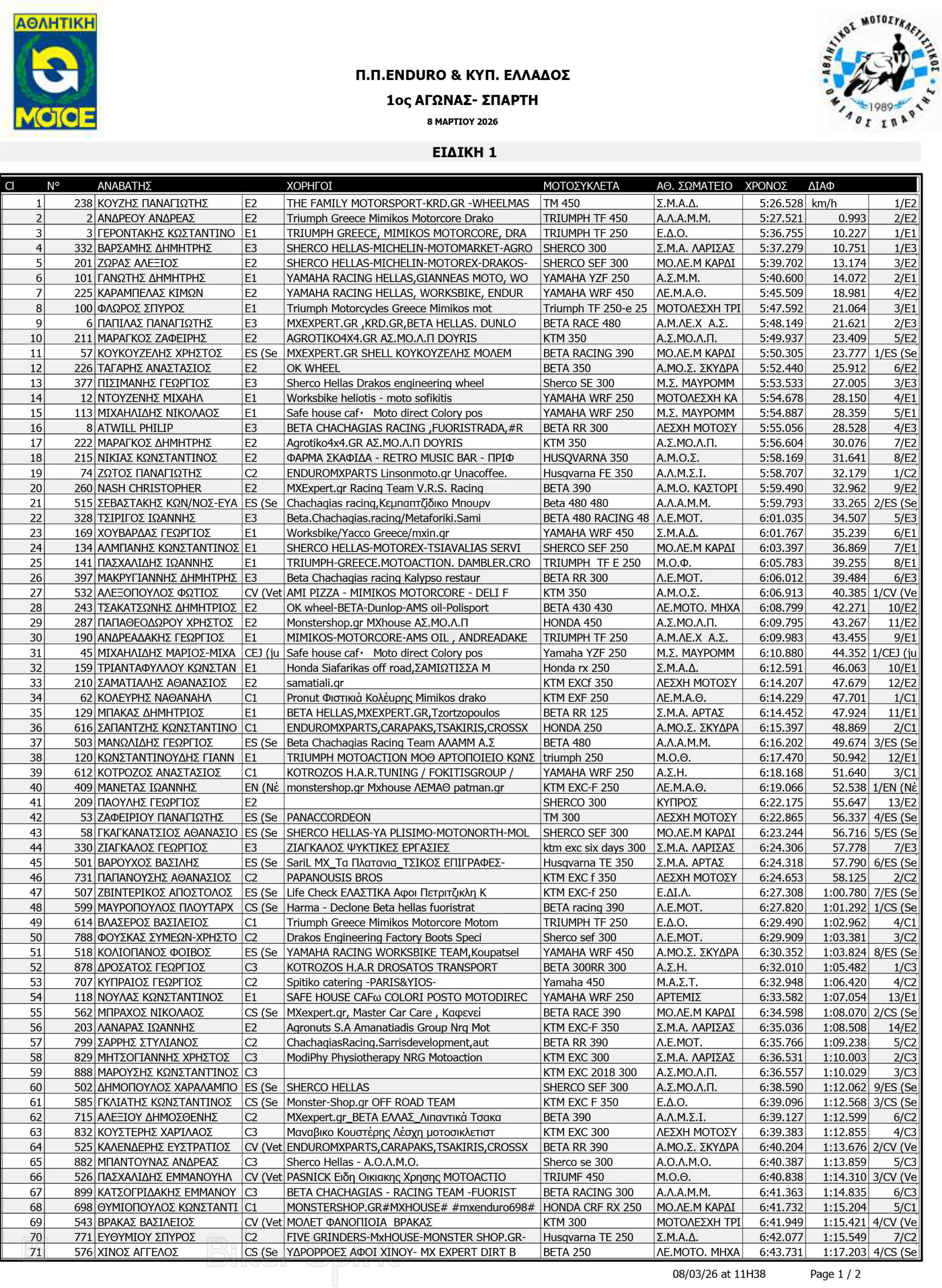 ΑΠΟΤΕΛΕΣΜΑΤΑ: 1ου αγώνα για το Πανελλήνιο Πρωτάθλημα Enduro και Κύπελλο Enduro 2026 – Σπάρτη