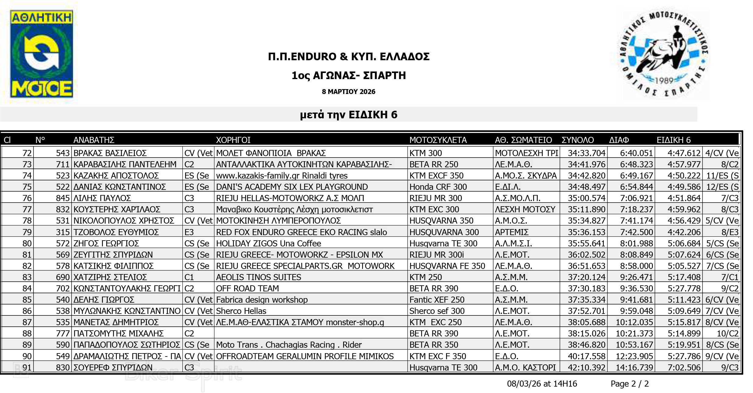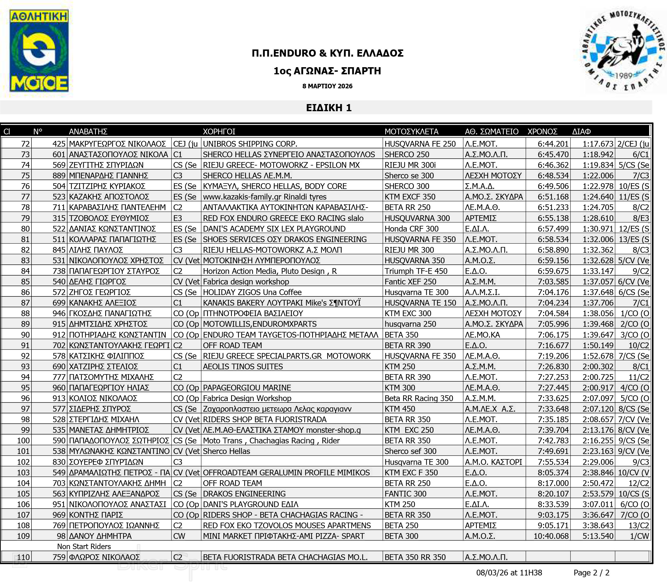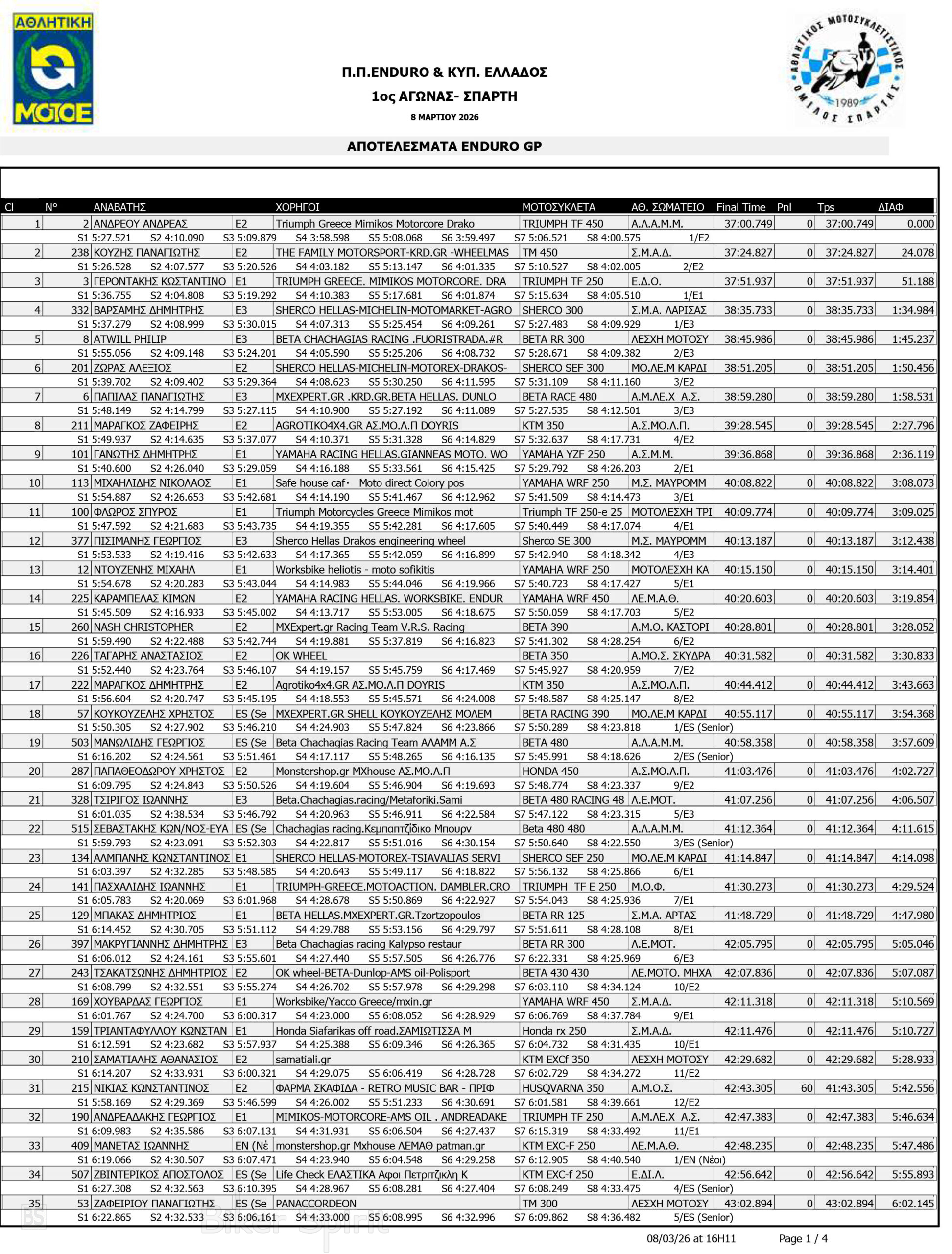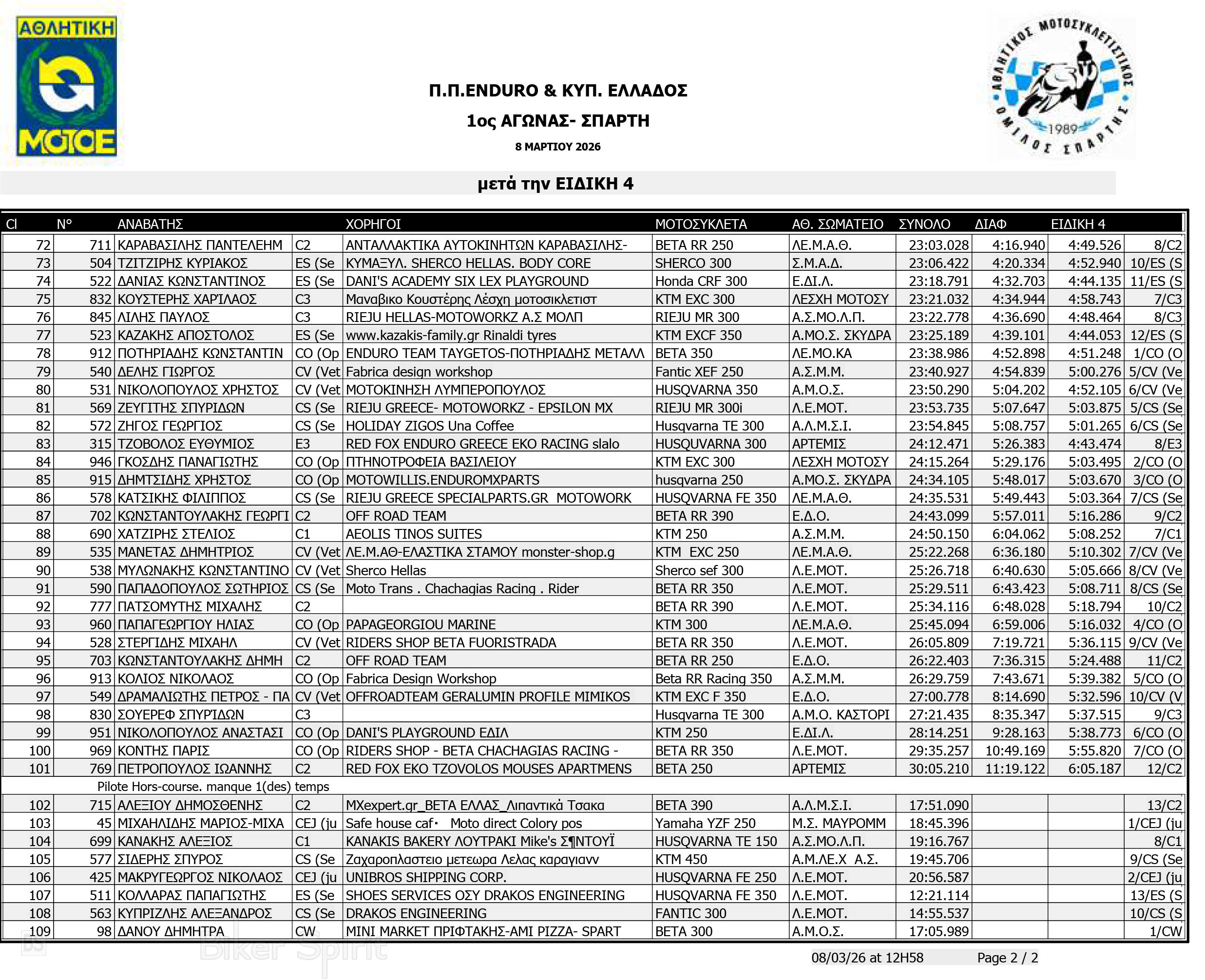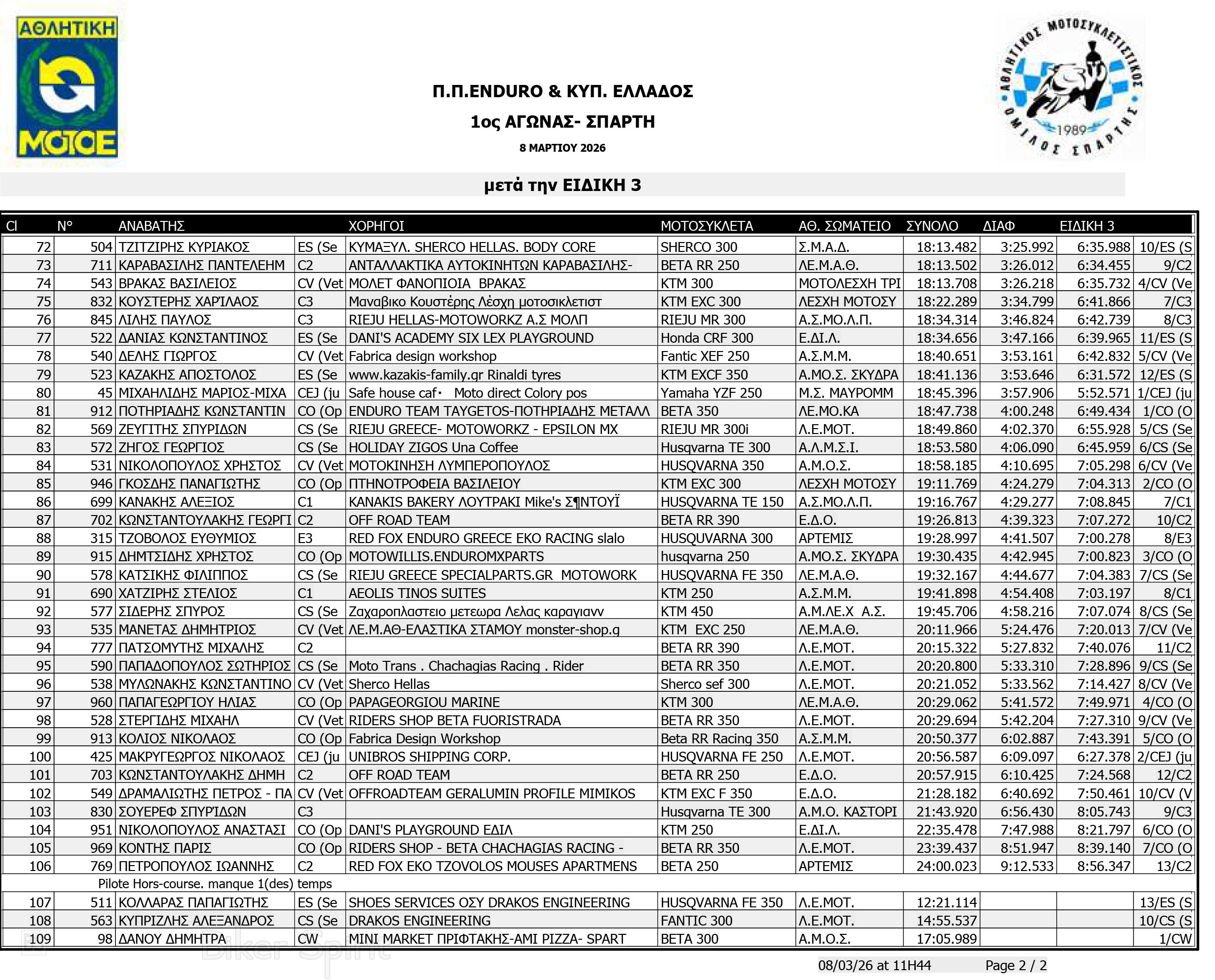 ΑΠΟΤΕΛΕΣΜΑΤΑ: 1ου αγώνα για το Πανελλήνιο Πρωτάθλημα Enduro και Κύπελλο Enduro 2026 – Σπάρτη