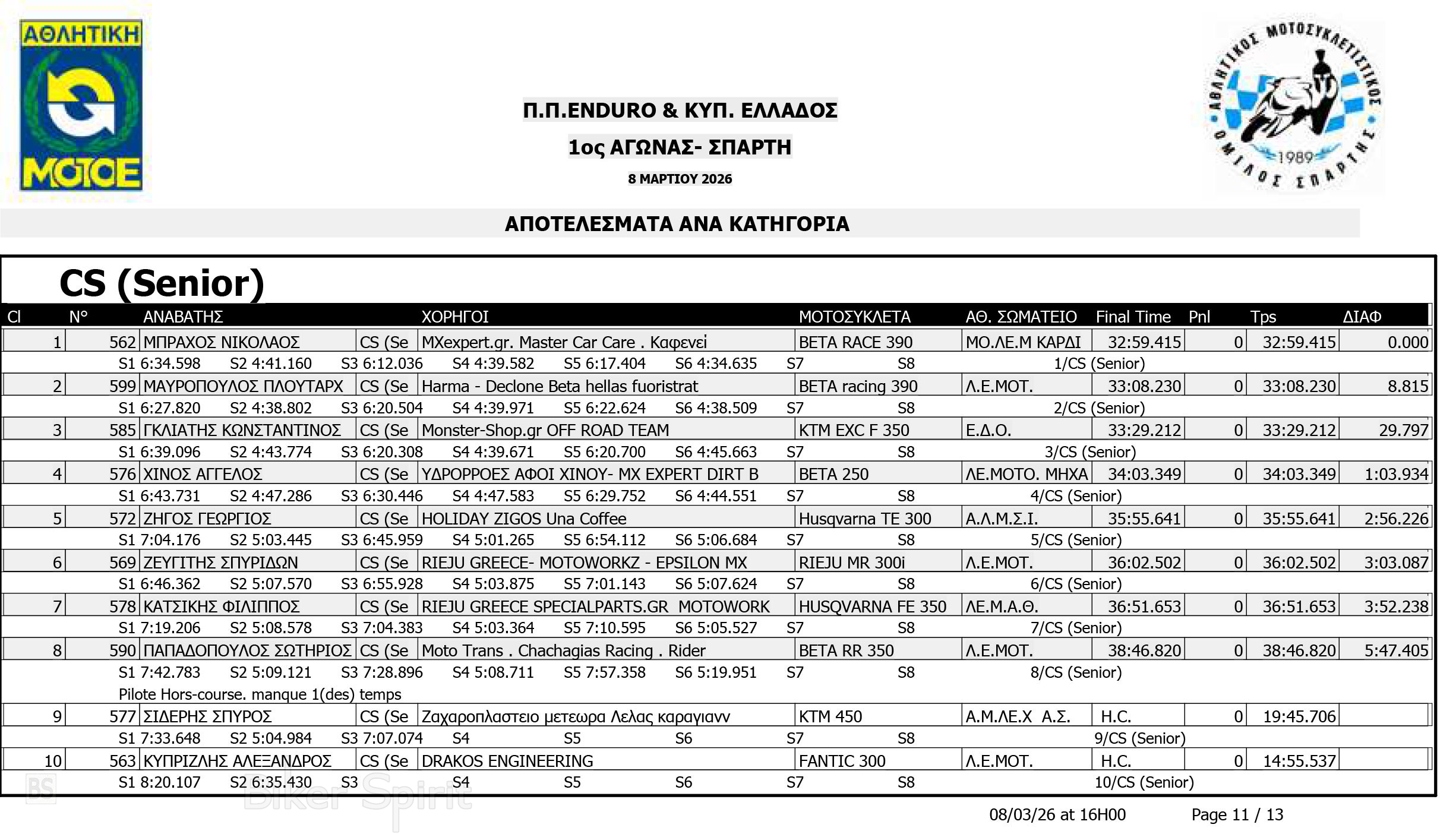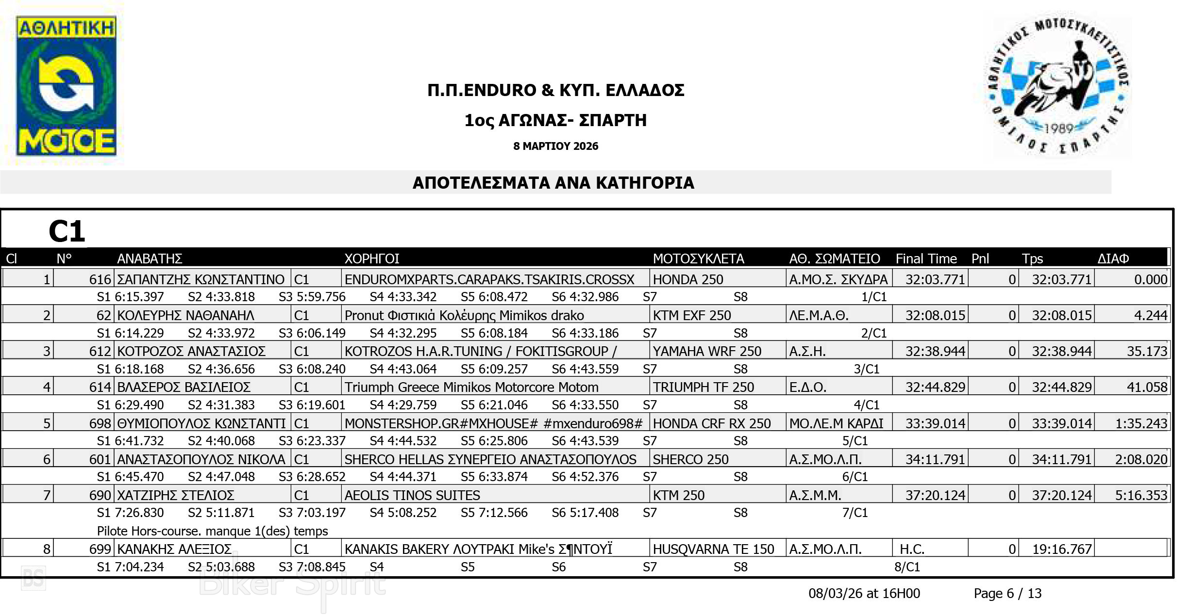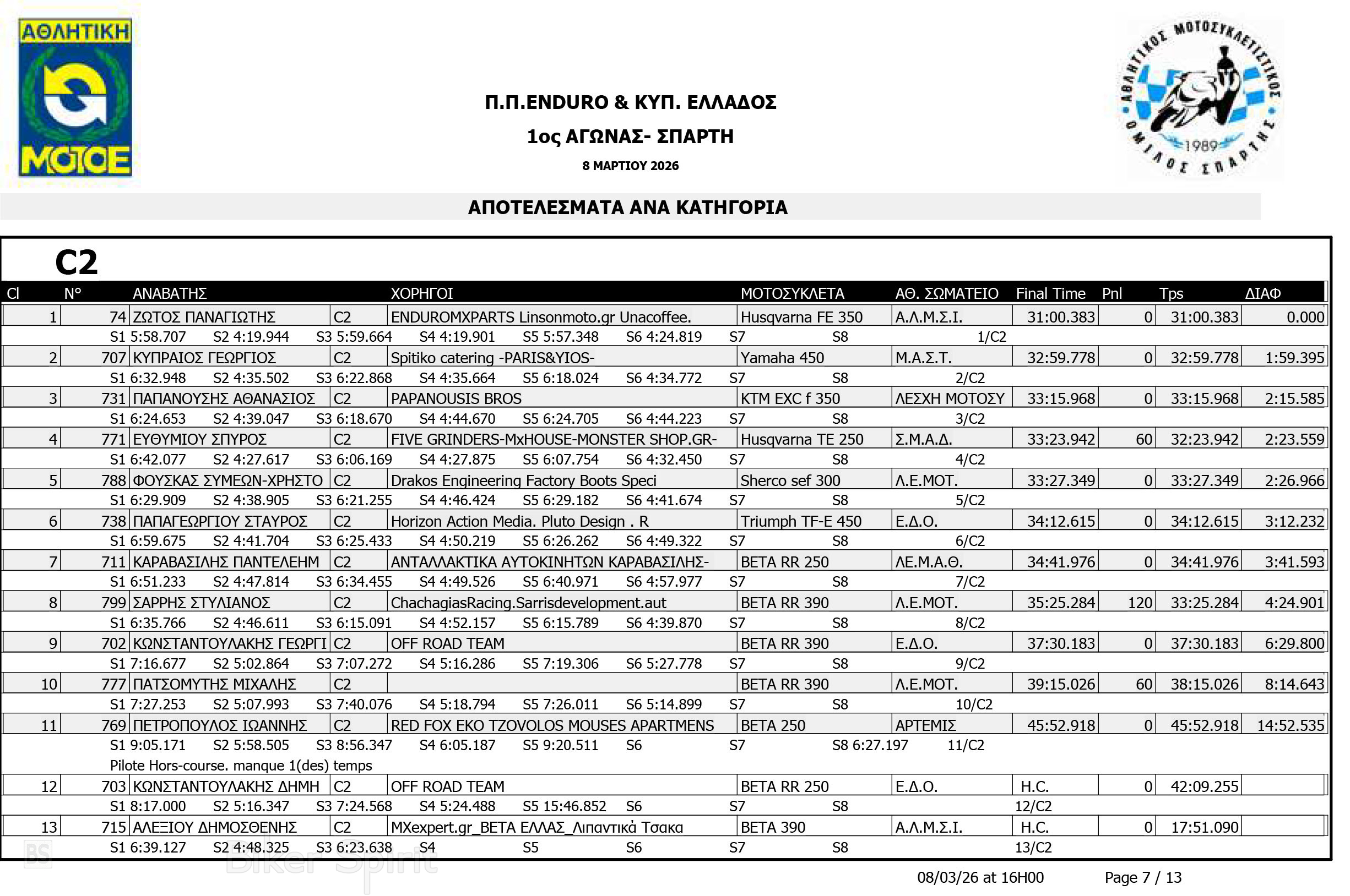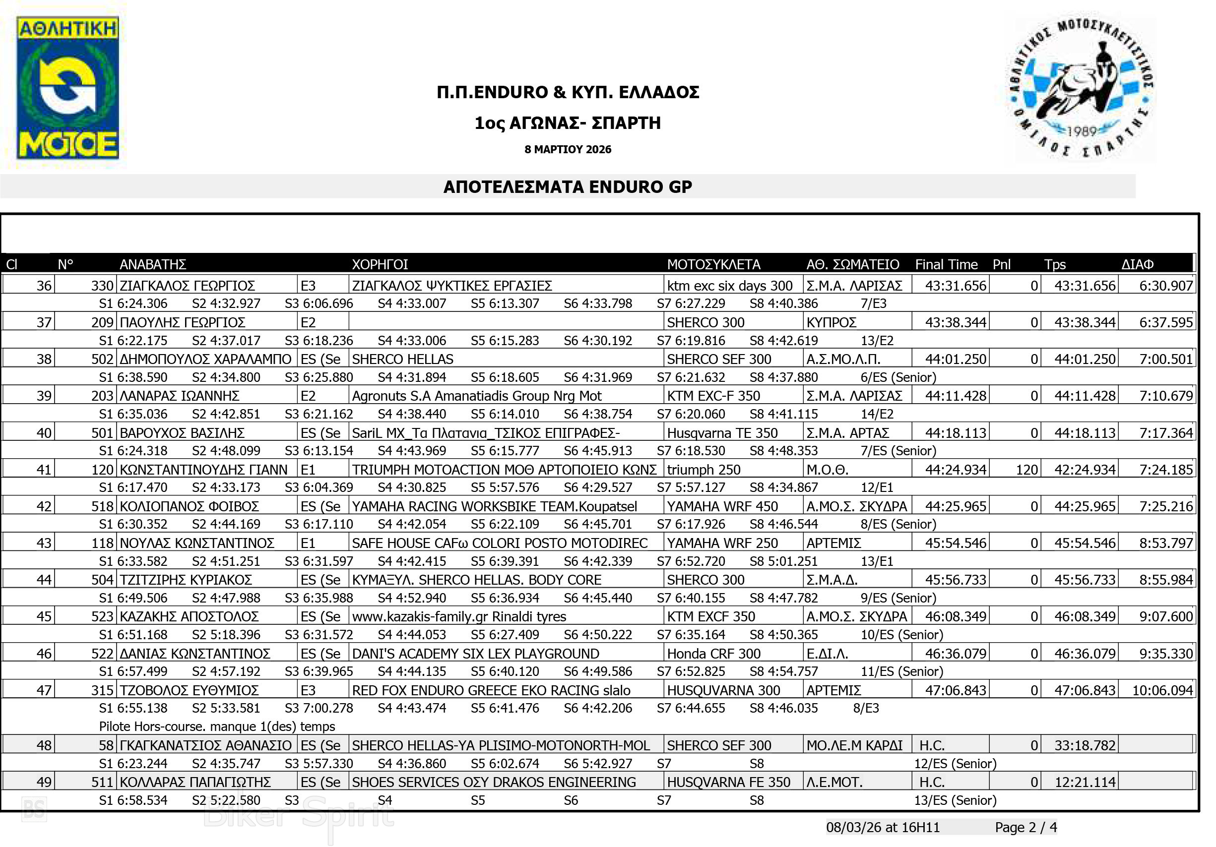ΑΠΟΤΕΛΕΣΜΑΤΑ: 1ου αγώνα για το Πανελλήνιο Πρωτάθλημα Enduro και Κύπελλο Enduro 2026 – Σπάρτη