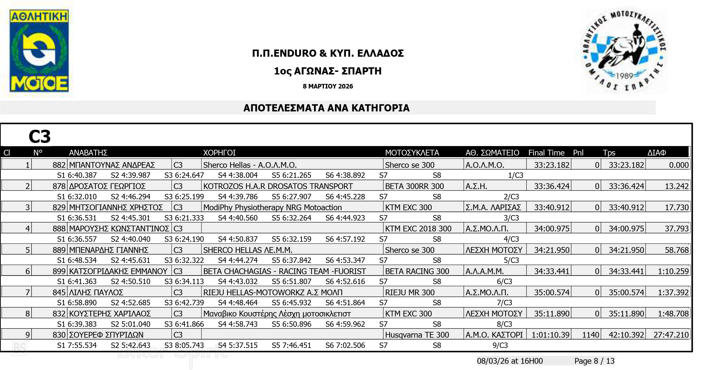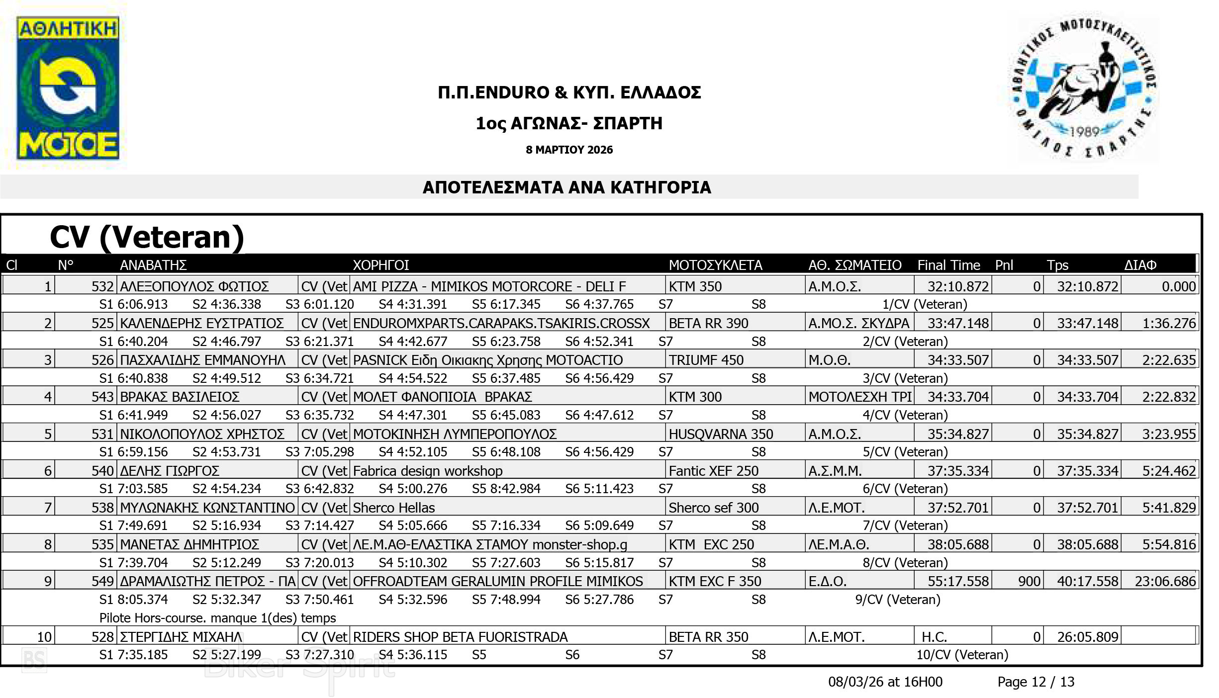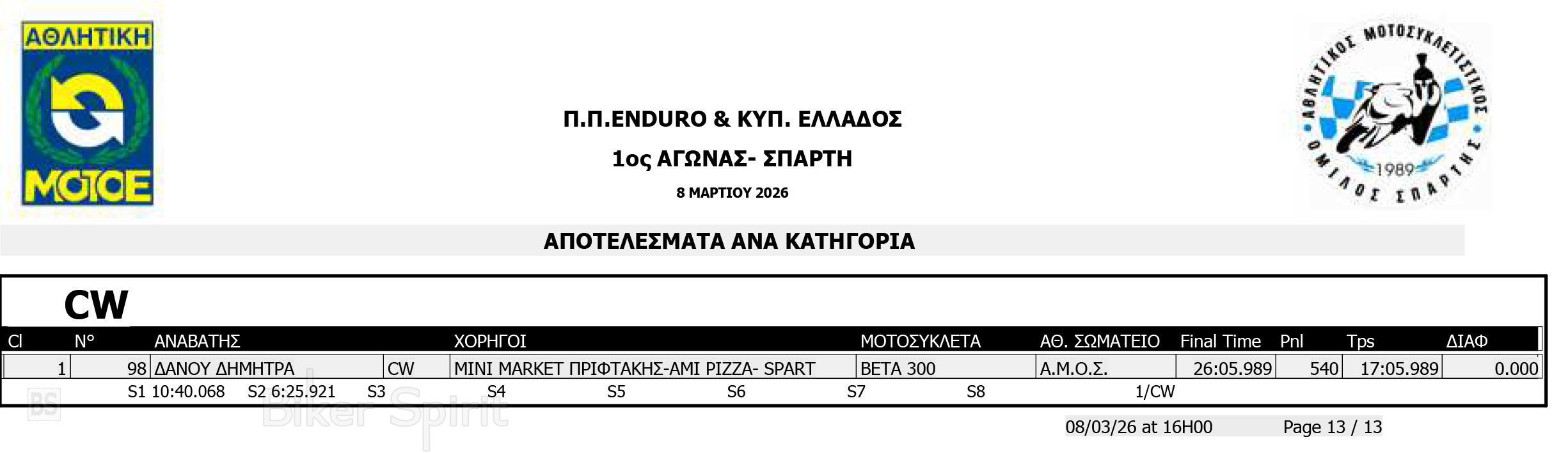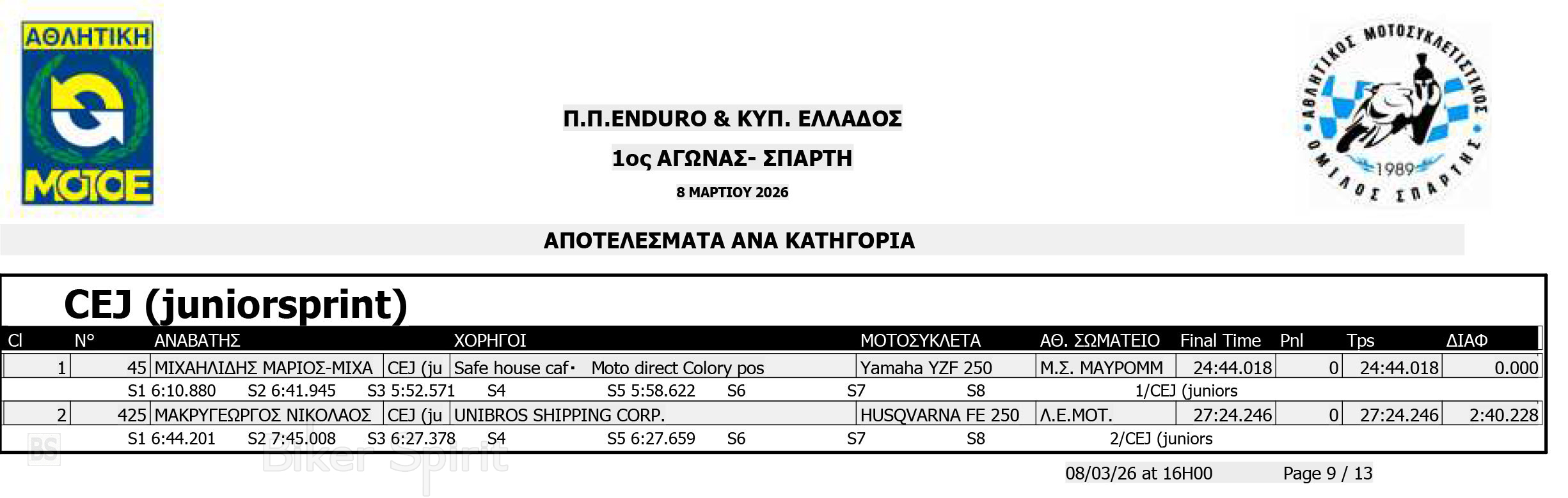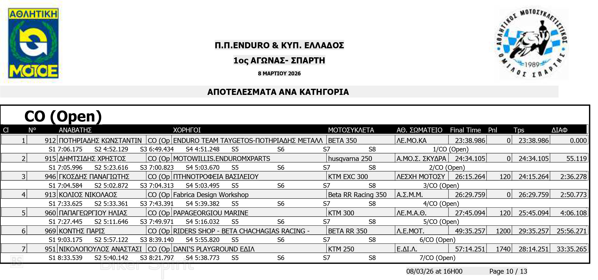 ΑΠΟΤΕΛΕΣΜΑΤΑ: 1ου αγώνα για το Πανελλήνιο Πρωτάθλημα Enduro και Κύπελλο Enduro 2026 – Σπάρτη